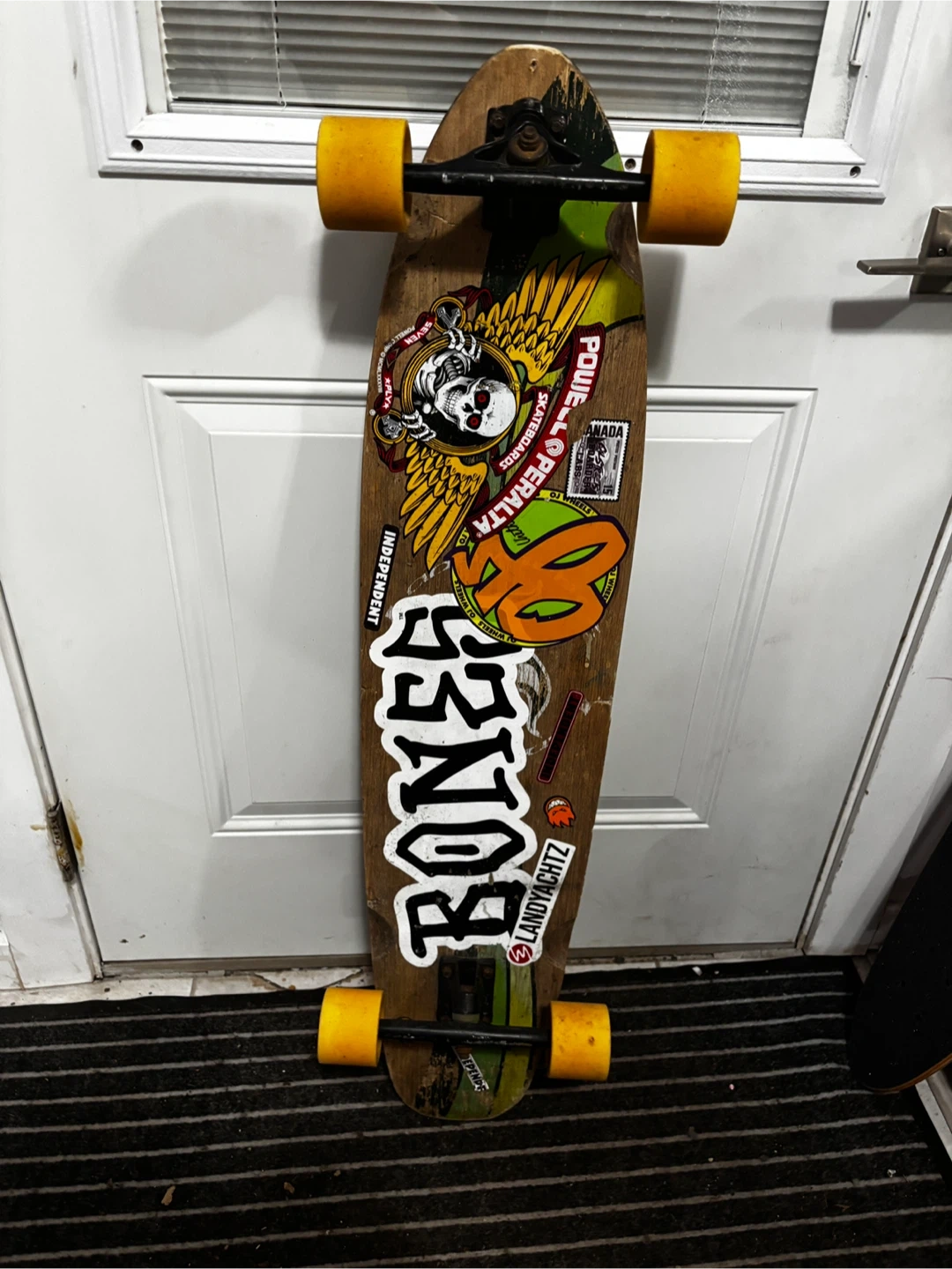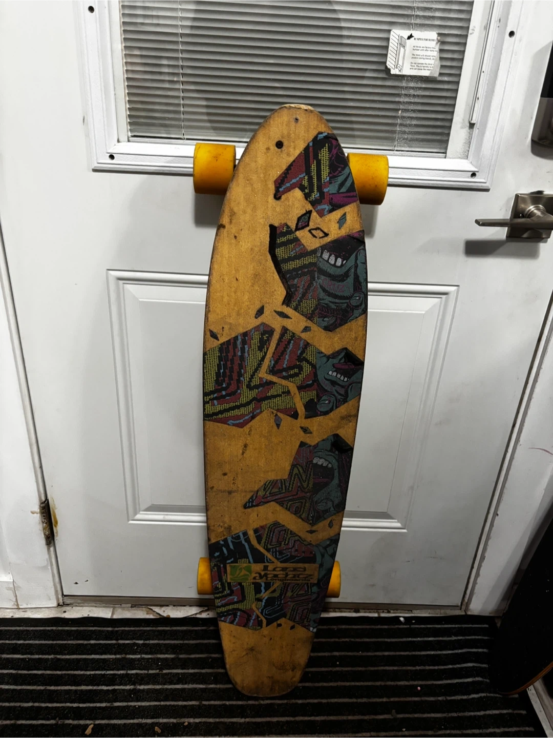 This is a used Landyachtz skateboard. It has 70mm Monster "Mimi" wheels and is covered in stickers. Rides pretty well and for the size nice on corners.