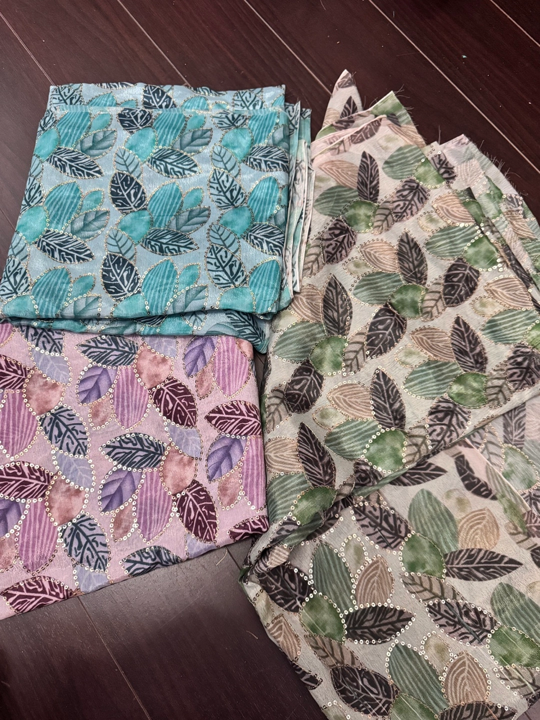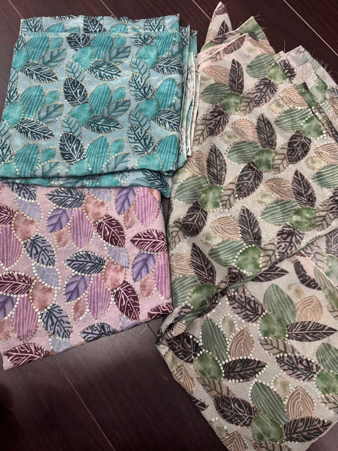 Three bundles of patterned fabric. Leaf design, various colours. Sequins or embellishments. Suitable for crafting or sewing . Punjabi 2.5 metre shirts