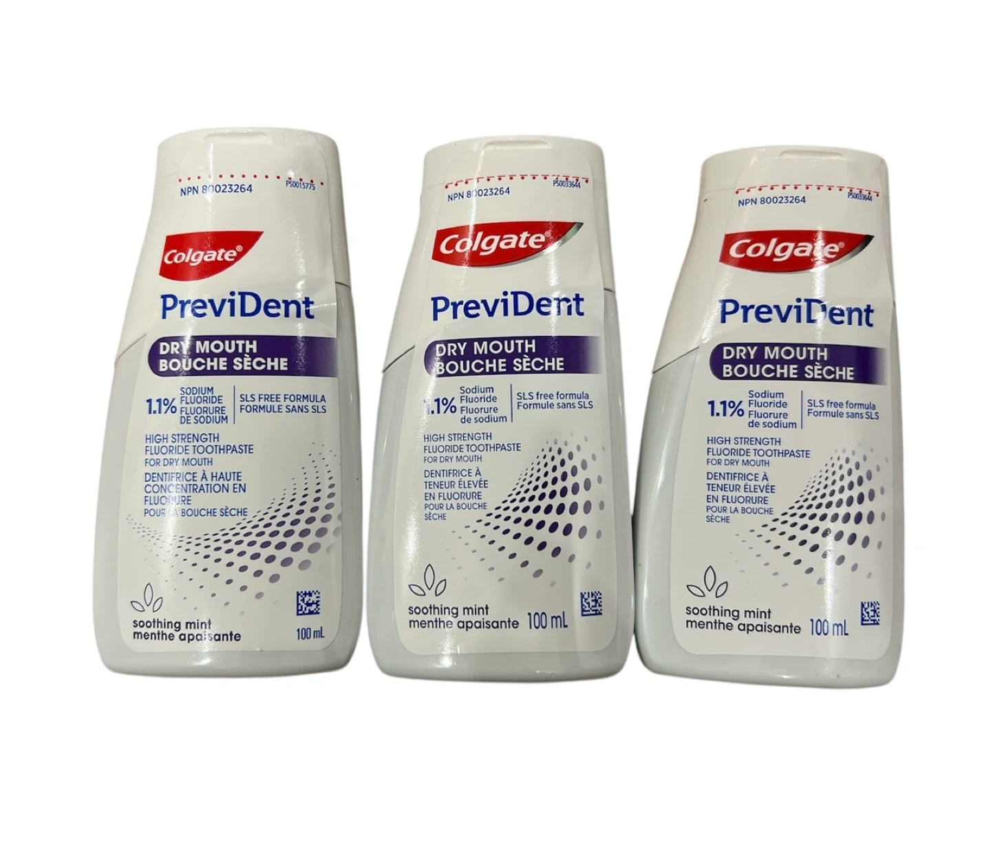 Three tubes of Colgate PreviDent Dry Mouth toothpaste are included. It's a high strength fluoride toothpaste with 1.1% sodium fluoride. This formula is SLS free and has a soothing mint flavour. 100 mL per tube.