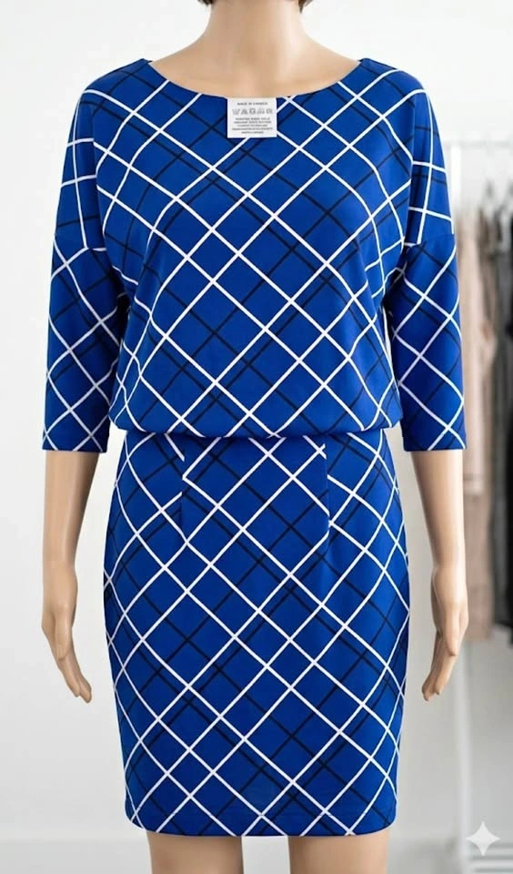 This stylish blue mini dress features a white and black geometric pattern. It has a flattering cinched waist and three-quarter sleeves. Dress it up or down for various occasions!