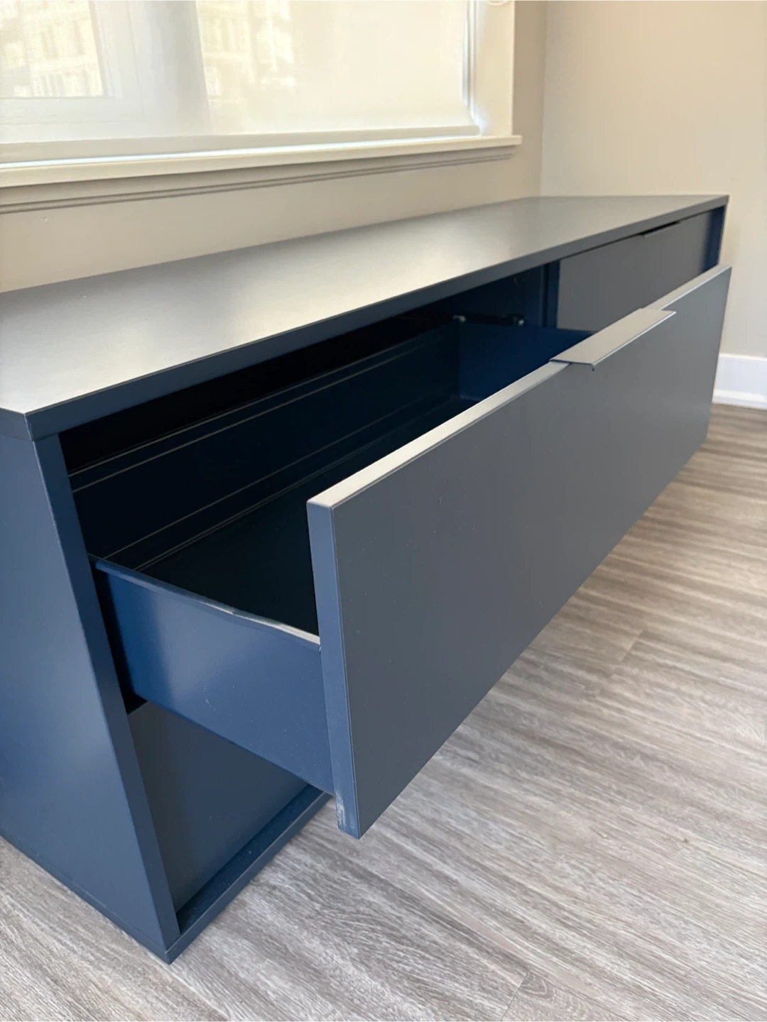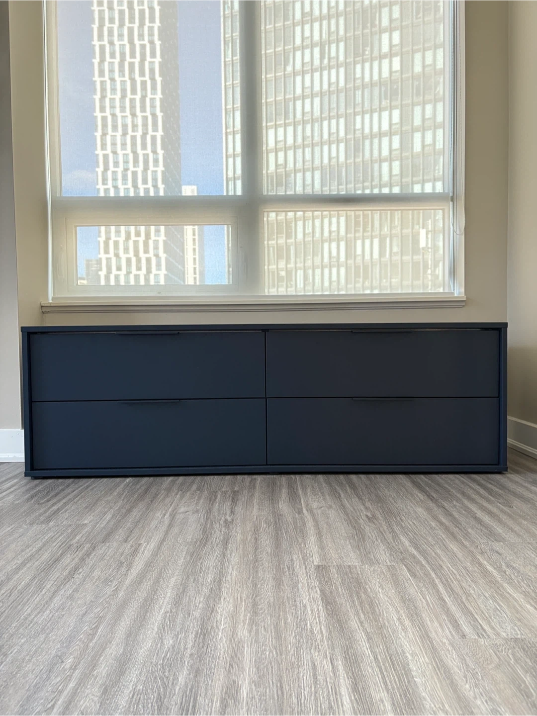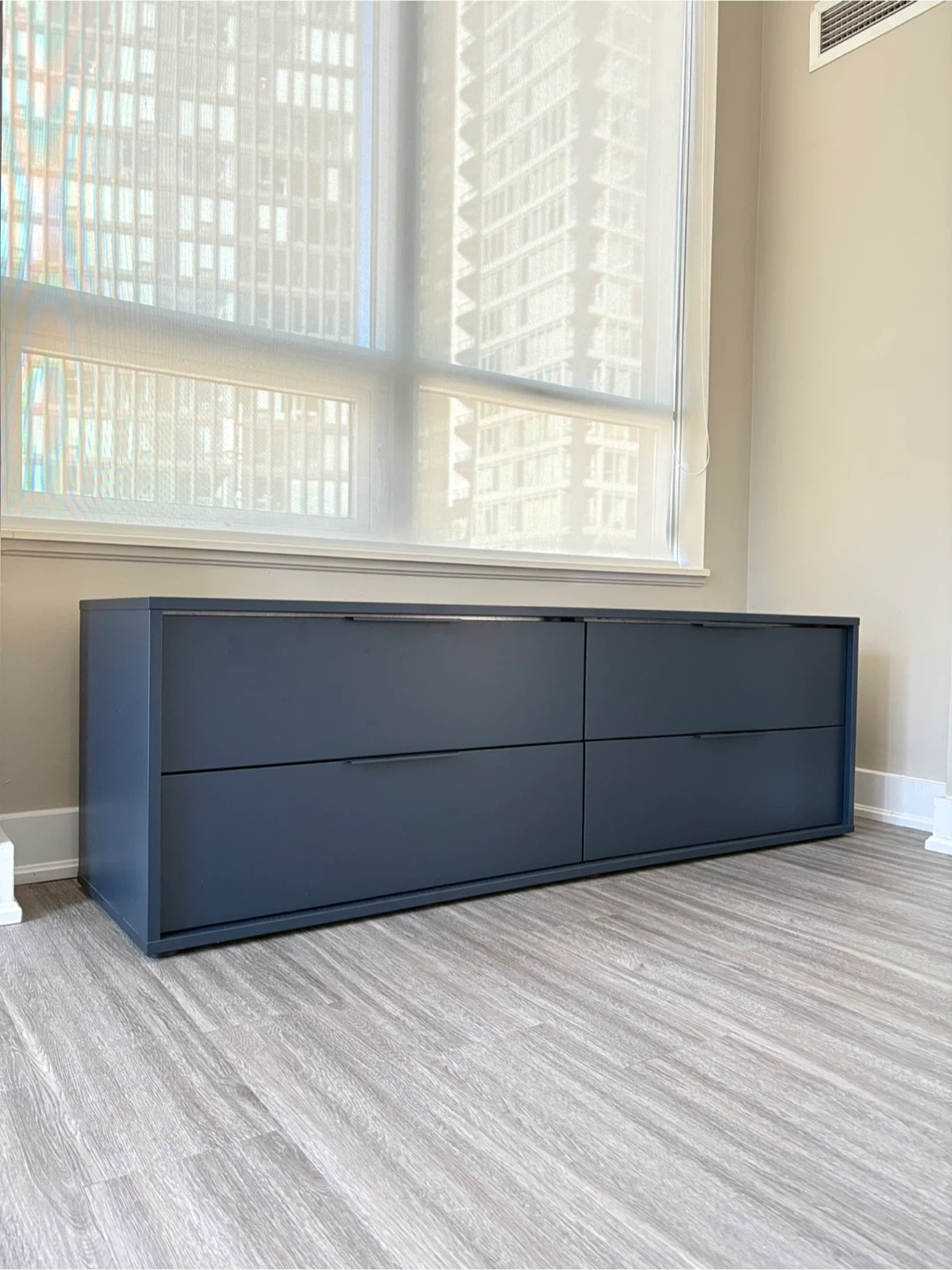 Moving SALE. A stylish dark blue media console with four drawers from IKEA. Ample storage space for entertainment essentials. A great piece for organizing the living room or bedroom. Built to double up as a bench. Minor dent in top back corner shown in one of the images. Engineered wood with slim metal handles. No longer available at IKEA, however, original retail price was $249.