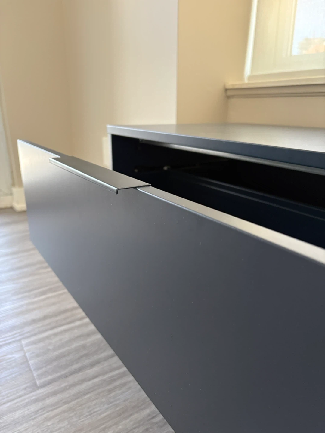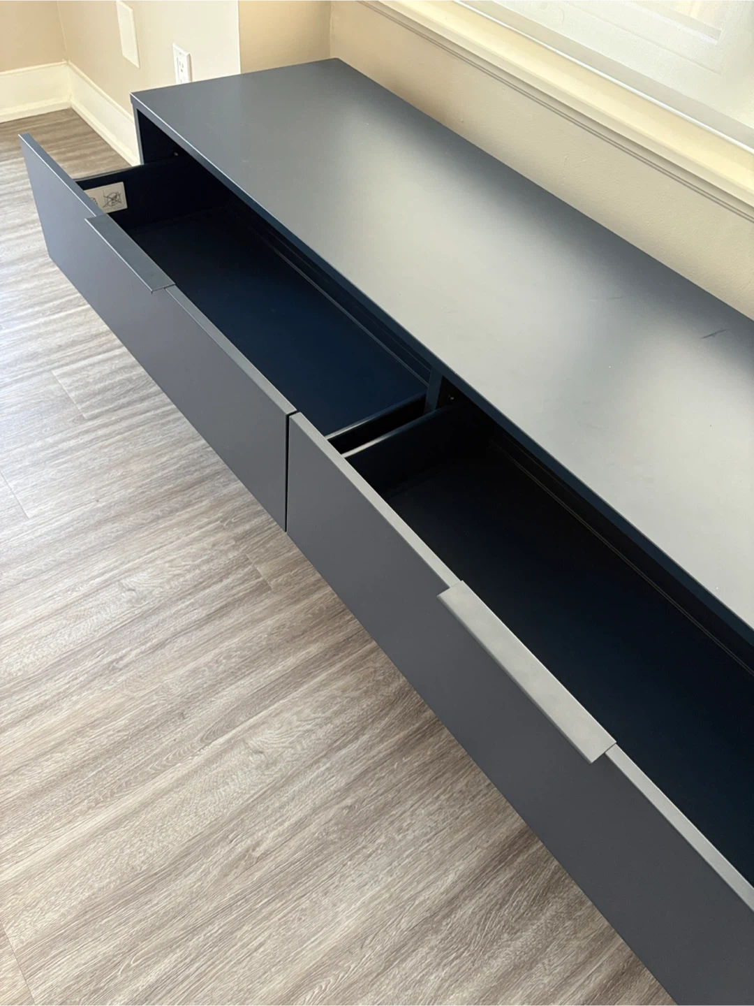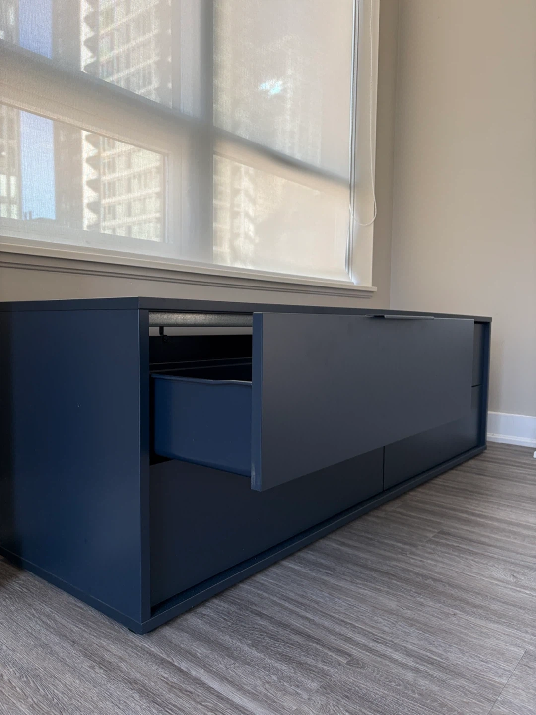 Moving SALE. A stylish dark blue media console with four drawers from IKEA. Ample storage space for entertainment essentials. A great piece for organizing the living room or bedroom. Built to double up as a bench. Minor dent in top back corner shown in one of the images. Engineered wood with slim metal handles. No longer available at IKEA, however, original retail price was $249.