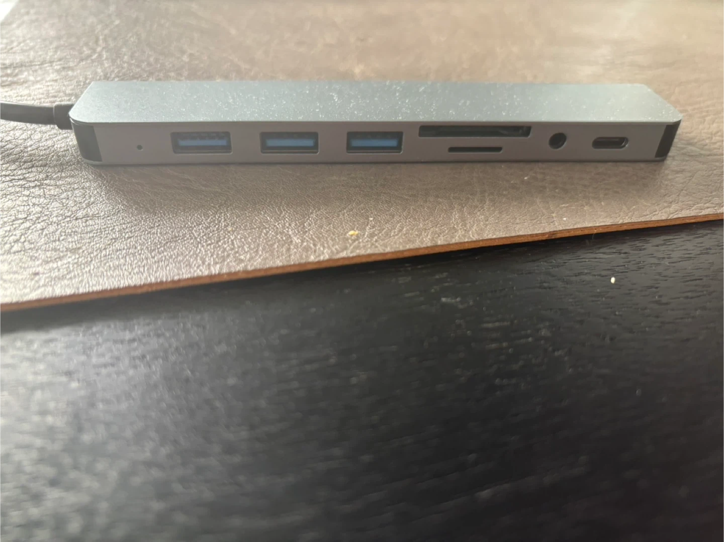 This silver USB C hub adapter comes with multiple ports for charging and data transfer. It includes USB-A ports, an SD card slot, and a USB-C port. This hub's compact design makes it handy for on-the-go use.