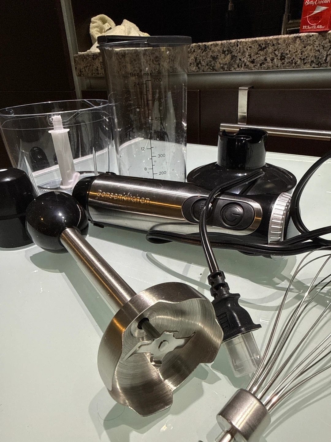 This is a Bonsenkitchen immersion blender. It comes with a blending wand, whisk attachment, and a measuring beaker. The beaker has markings up to 700ml.