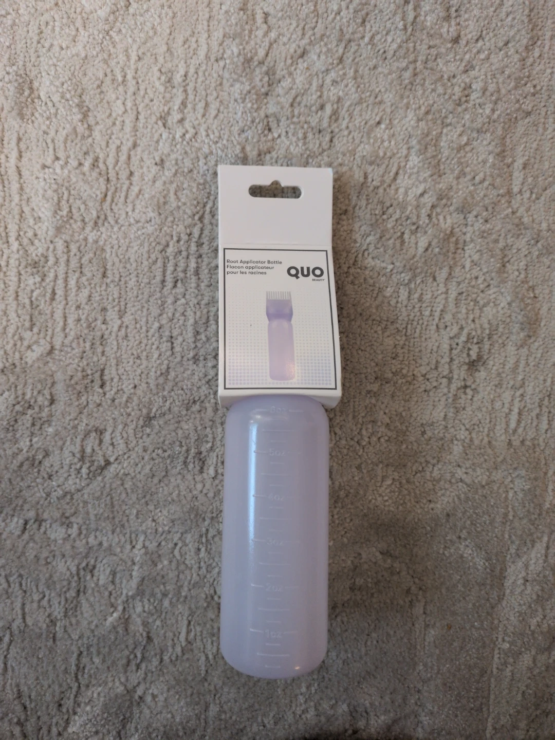 QUO Beauty root applicator bottle/scalp care bottle for hair colour. It's a 6oz bottle with clear measurement markings. This bottle is perfect for precise root application of hair dye.