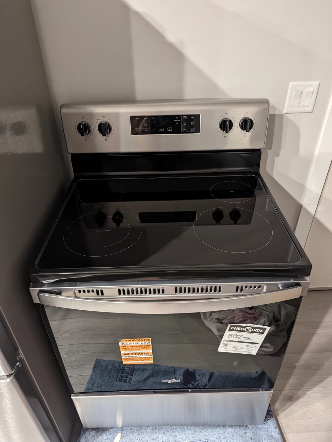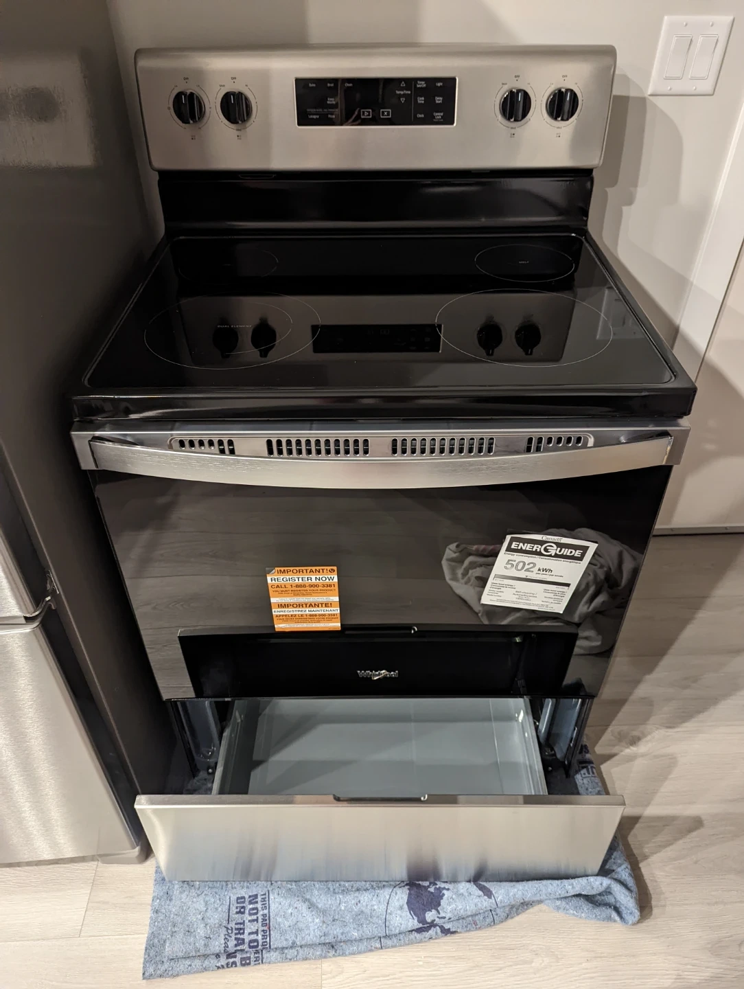 This Whirlpool electric range features a smooth glass-ceramic cooktop and a spacious oven interior. It comes with a warming drawer at the bottom. The exterior is stainless steel and black. Brand new, with warranty included.