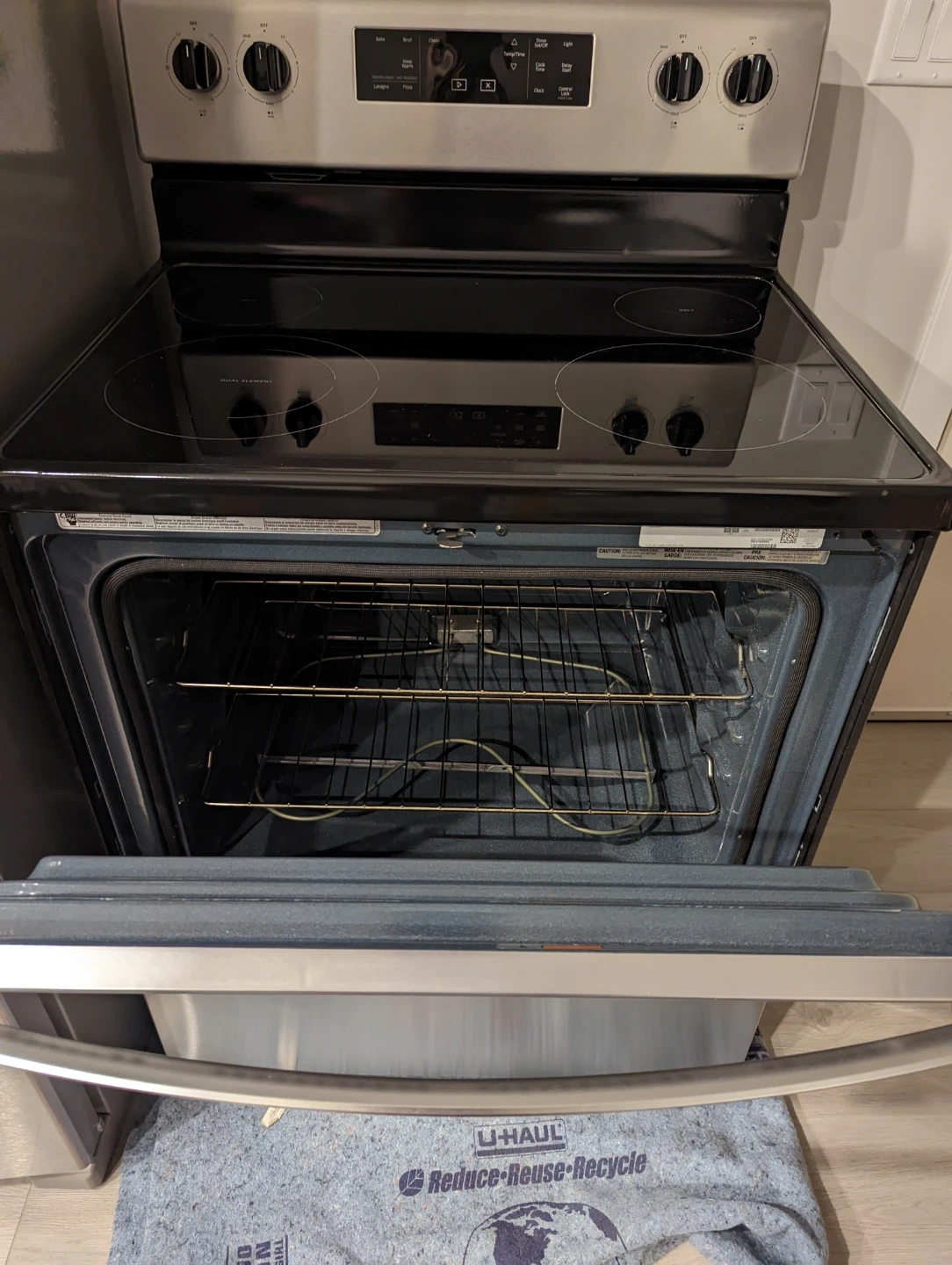 This Whirlpool electric range features a smooth glass-ceramic cooktop and a spacious oven interior. It comes with a warming drawer at the bottom. The exterior is stainless steel and black. Brand new, with warranty included.