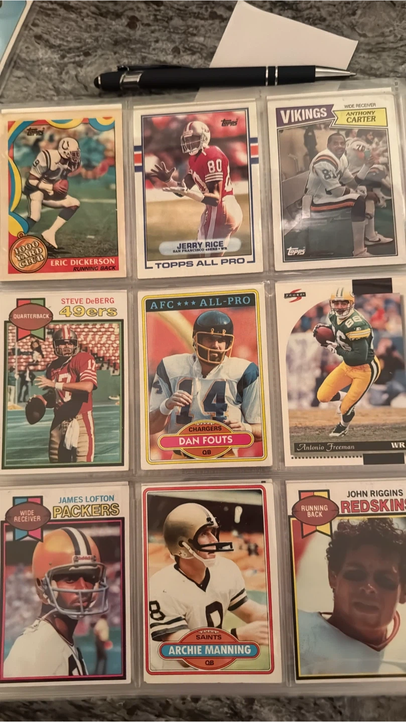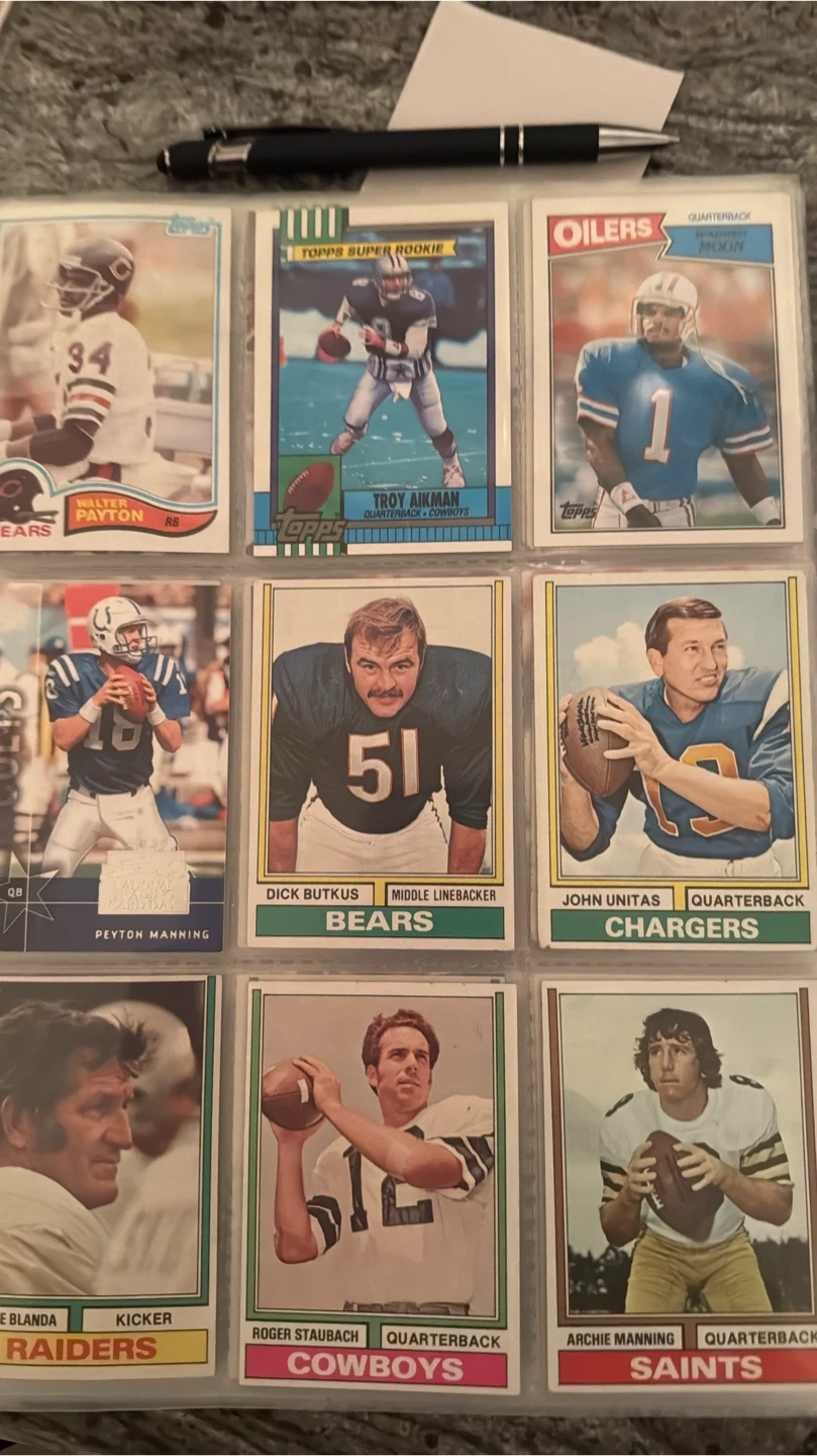 Selling a collection of vintage NFL football cards featuring various legendary players. Cards include players like Walter Payton, Troy Aikman, John Unitas, and many more. Great for any football memorabilia collector!