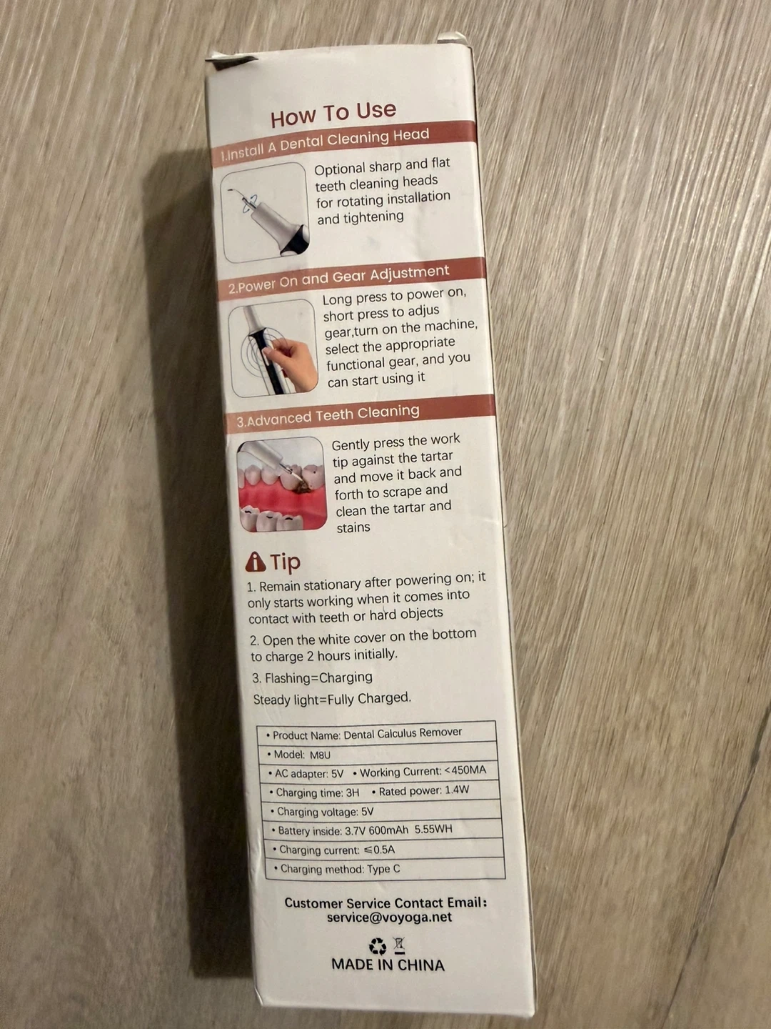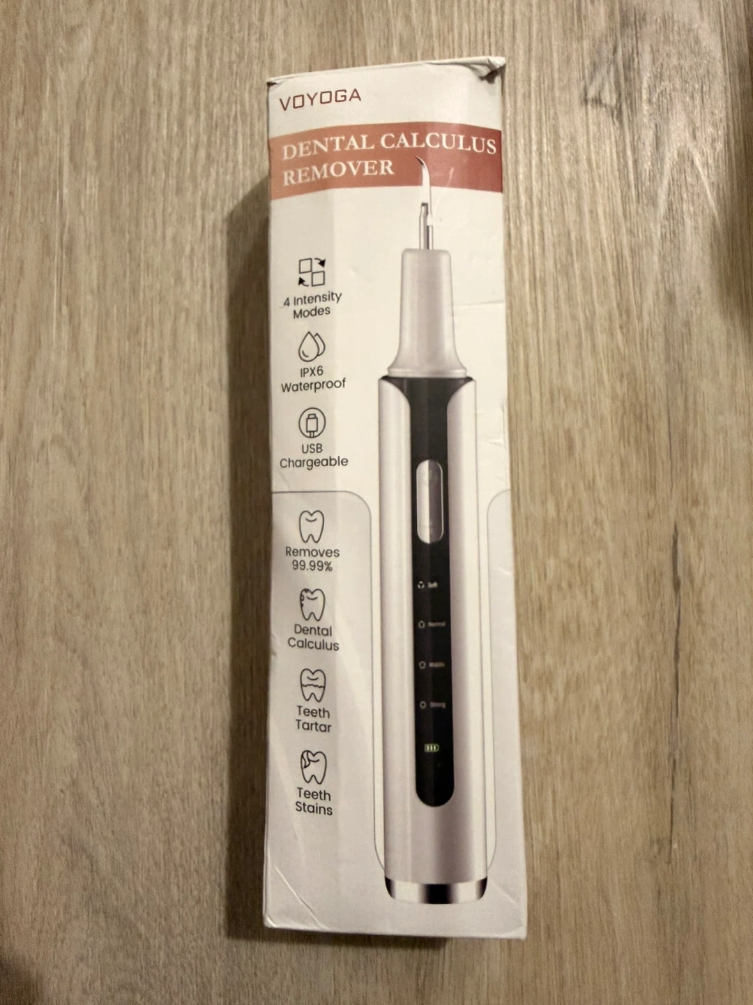 This is a VOYOGA Dental Calculus Remover. It's USB rechargeable and features 4 intensity modes. It's waterproof with an IPX6 rating.
