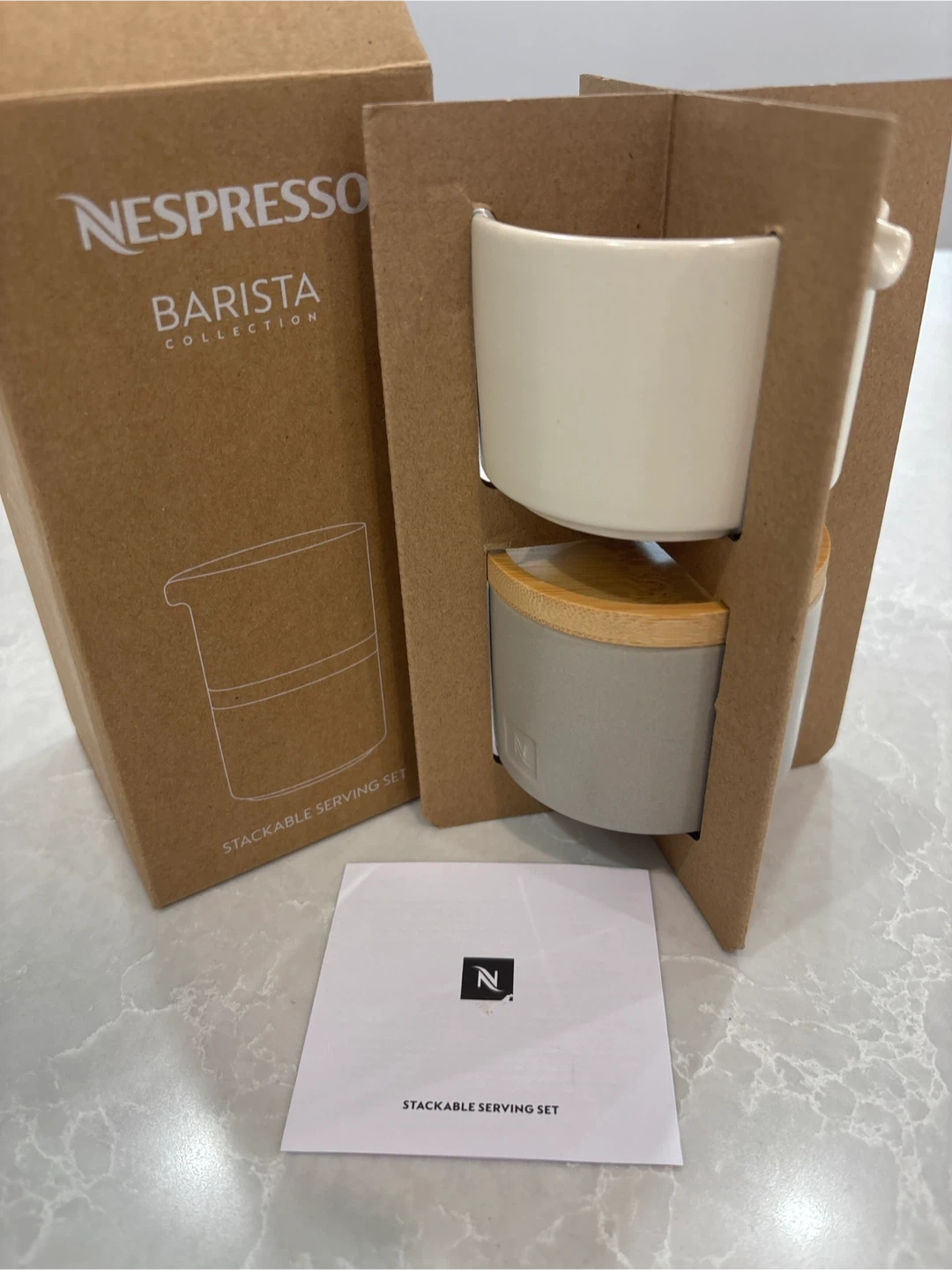 This is the Nespresso Barista Collection stackable serving set. It includes a white ceramic cup and a grey container with a bamboo lid. The set comes in its original packaging.