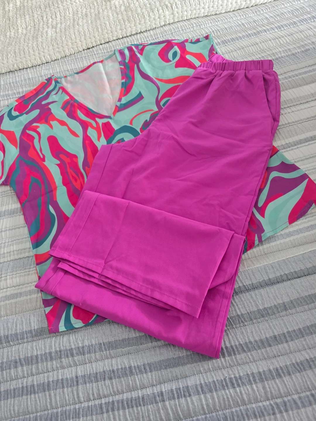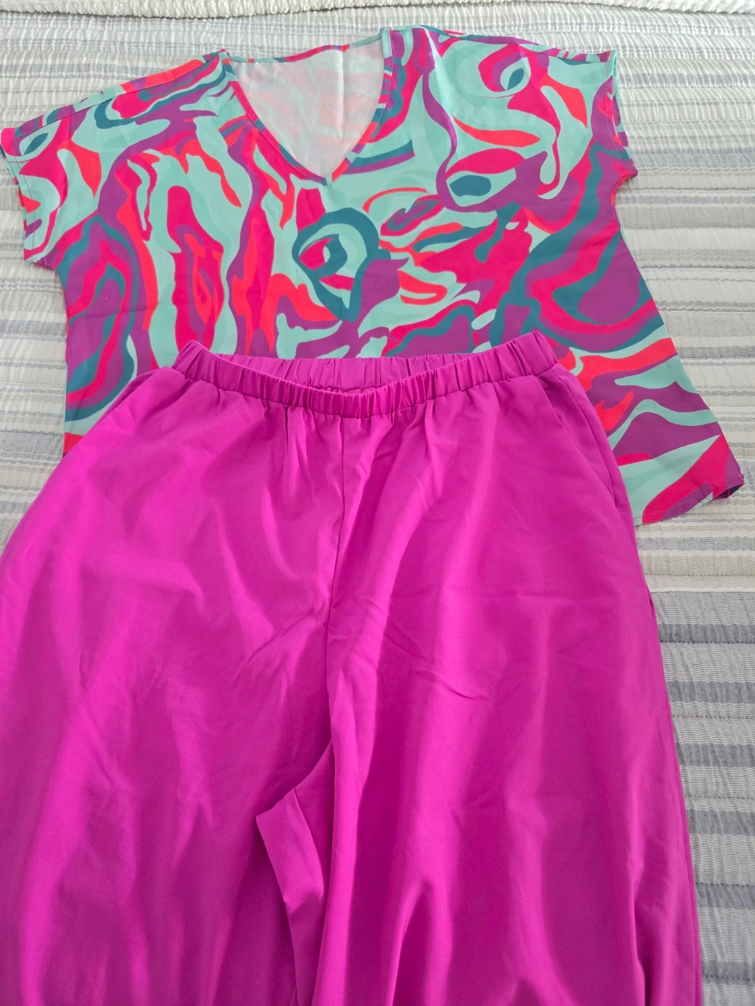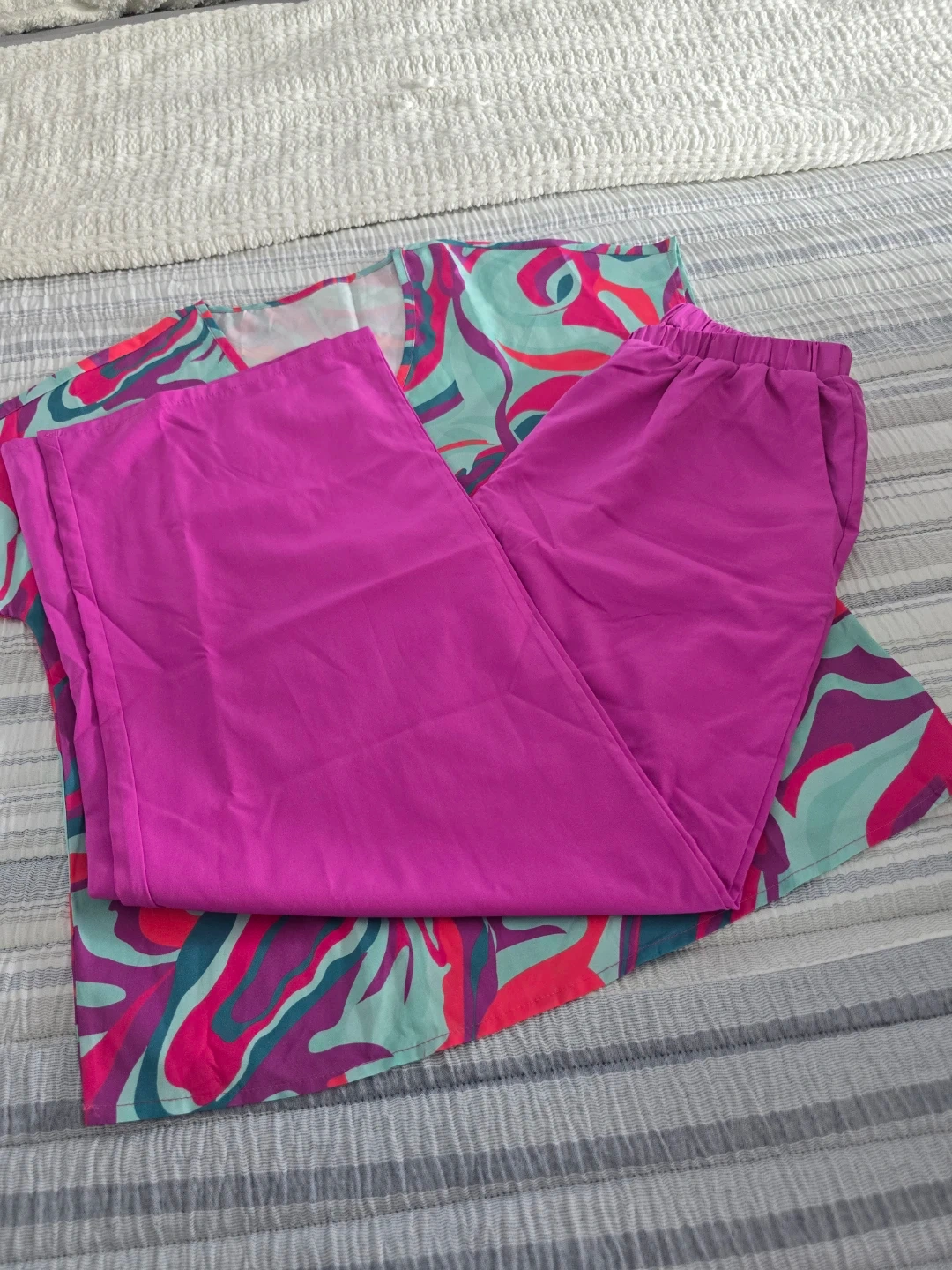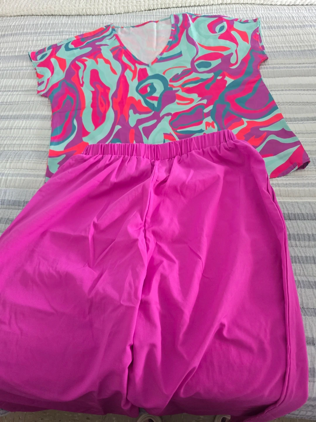 Selling a fun and vibrant top and pants set! The top has a colorful, abstract pattern, and the pants are a bright, solid pink. Both pieces are in great condition and ready for a new home!