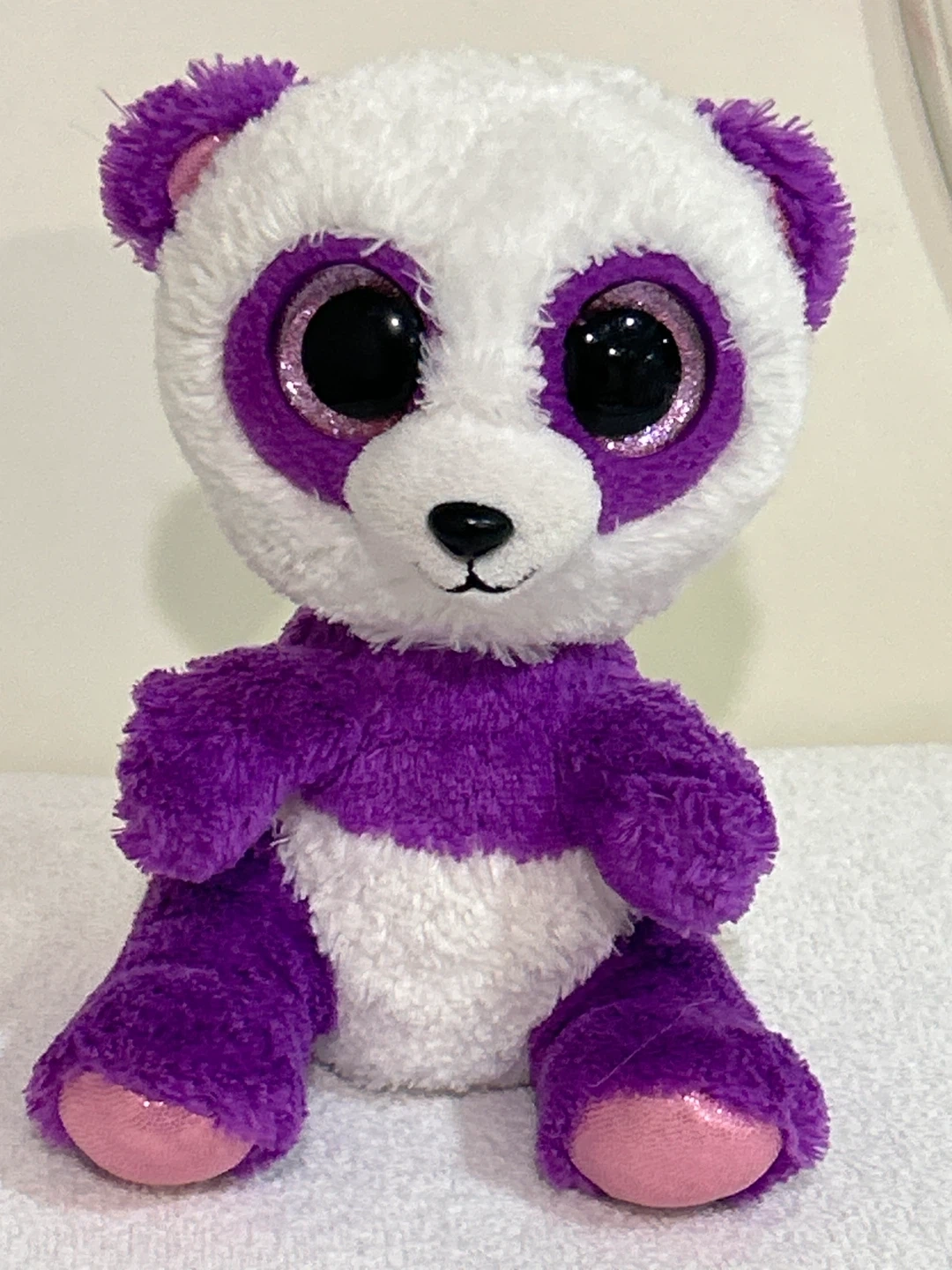 This adorable Ty Beanie Boos Bamboo Panda plush is looking for a new home! 6”. It features a cute purple and white design with sparkly eyes. Perfect for kids or collectors