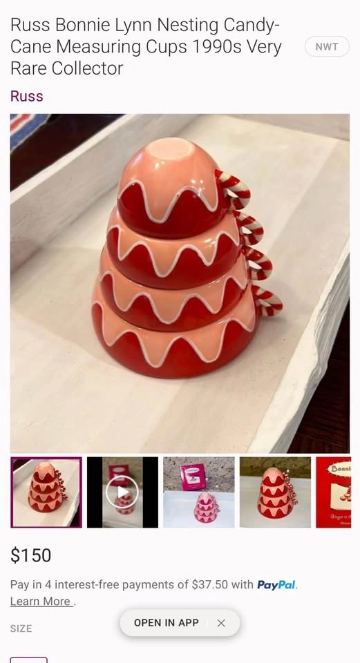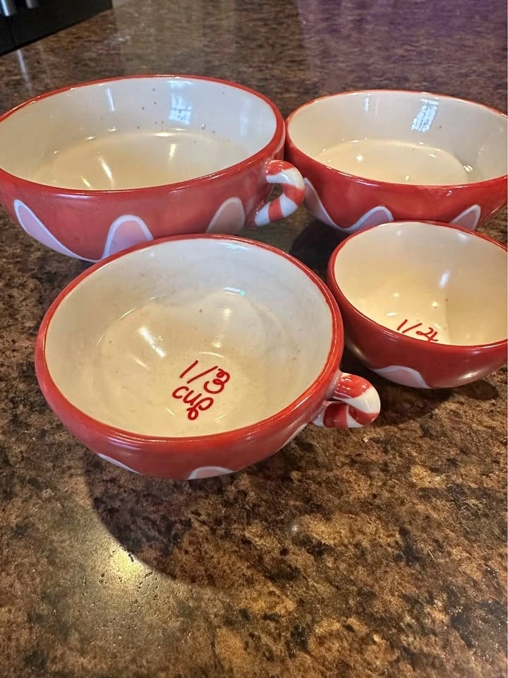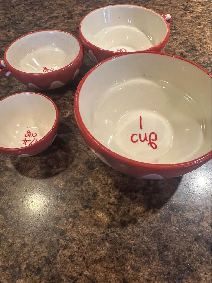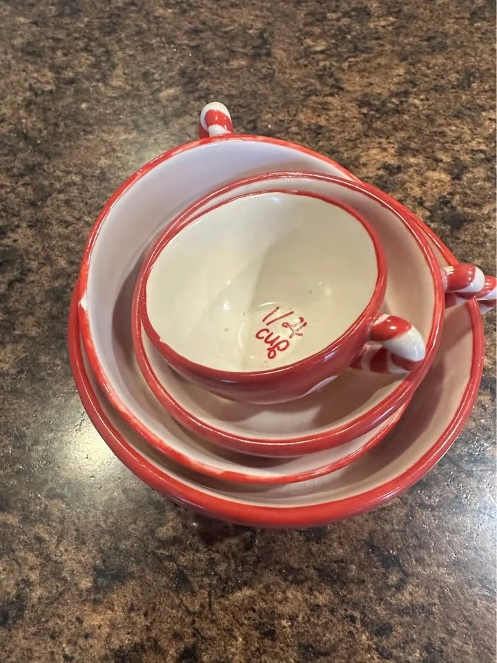 This set includes four stackable Bonnie Lynn Russ ceramic measuring cups.