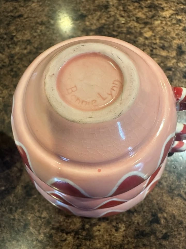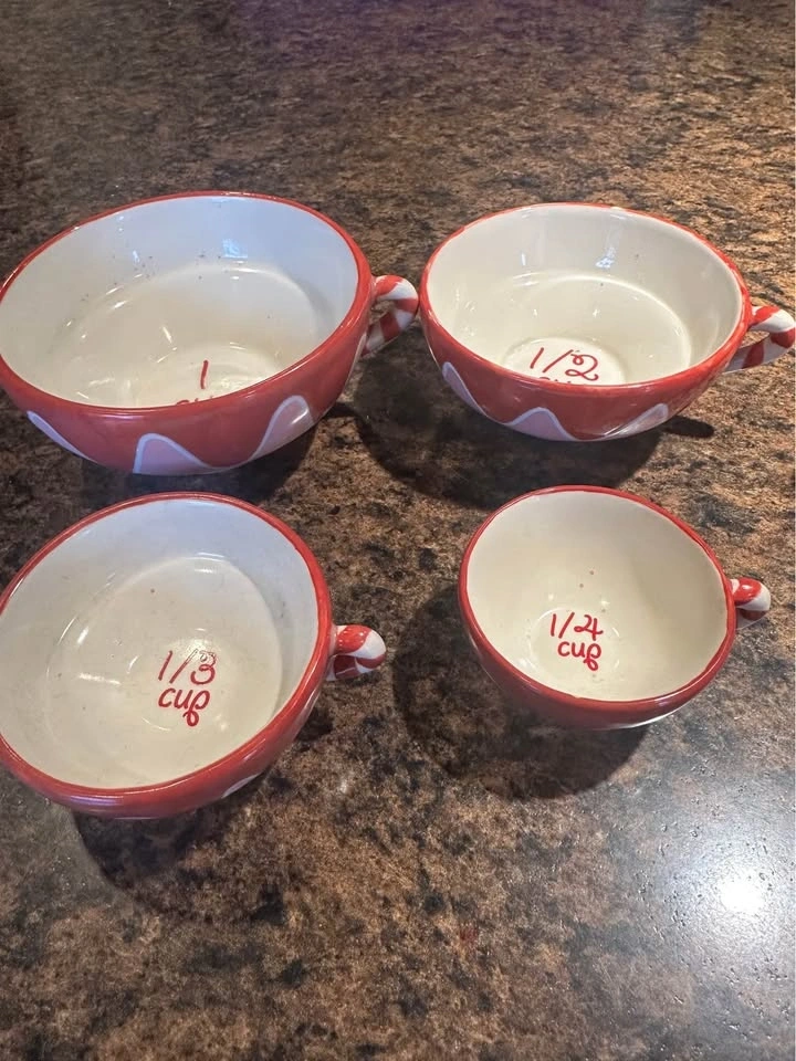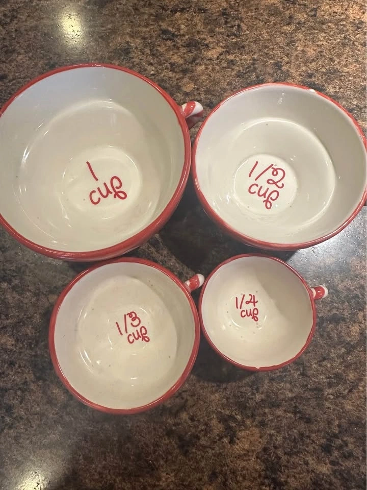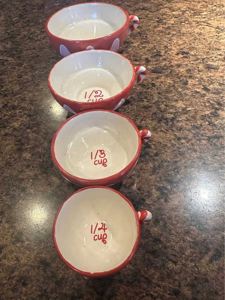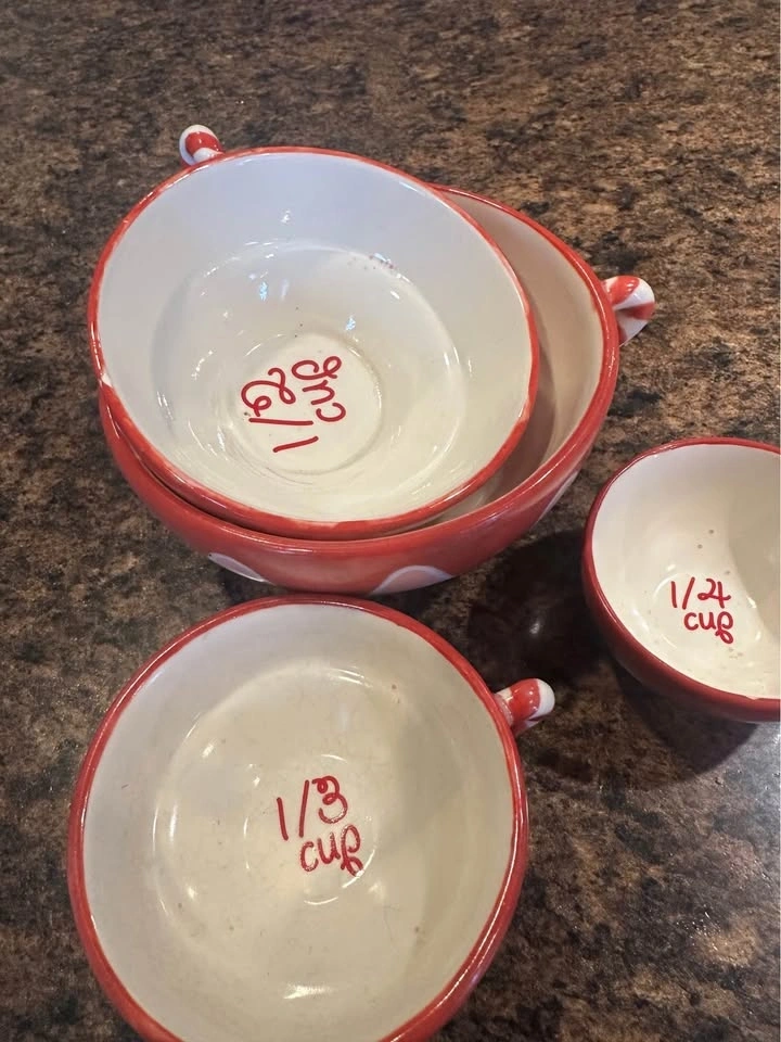 This set includes four stackable Bonnie Lynn Russ ceramic measuring cups.