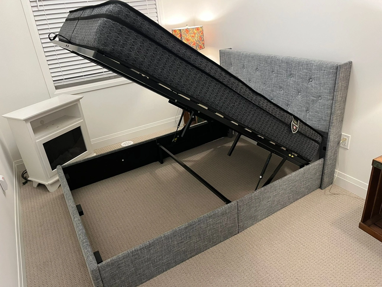 Grey upholstered bed frame with storage. Includes headboard, footboard, and mattress support.