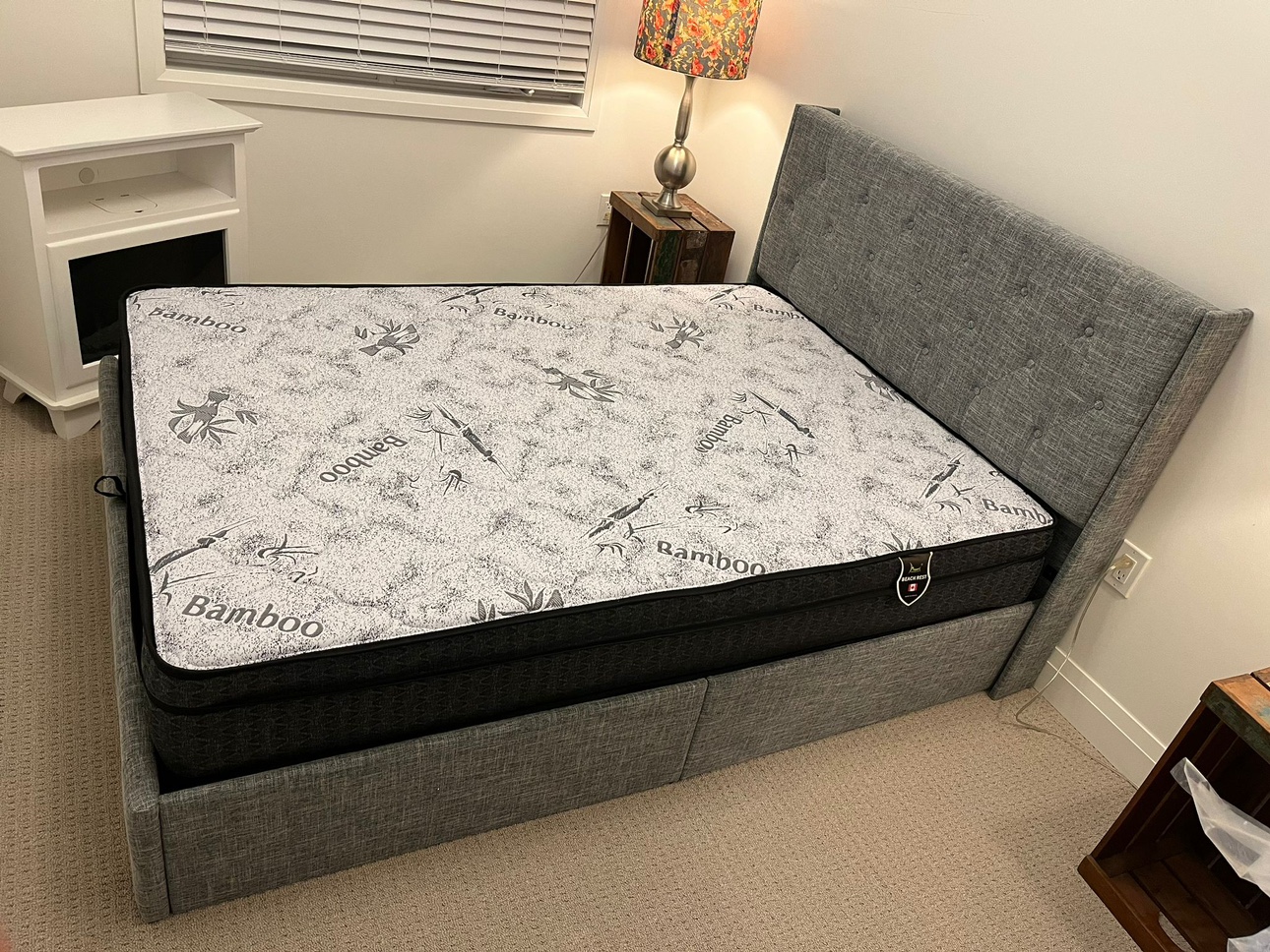 Grey upholstered bed frame with storage. Includes headboard, footboard, and mattress support.