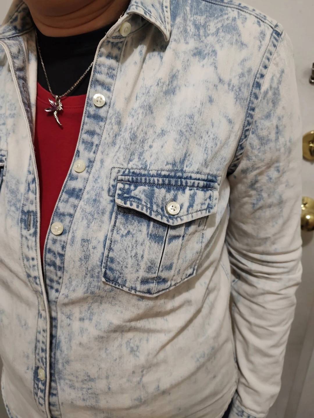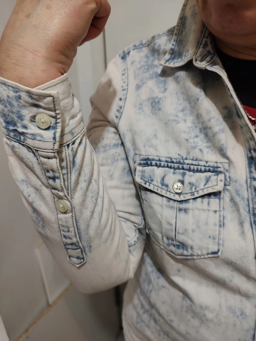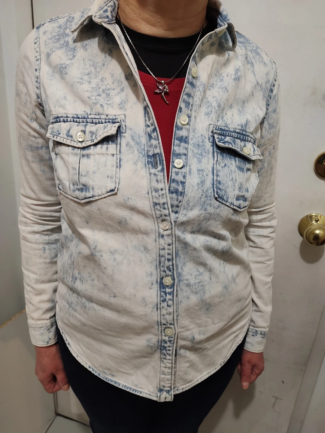 I'm selling an acid wash denim shirt! It has a unique, faded look and classic button-down style. Perfect for casual wear or layering. In great condition!