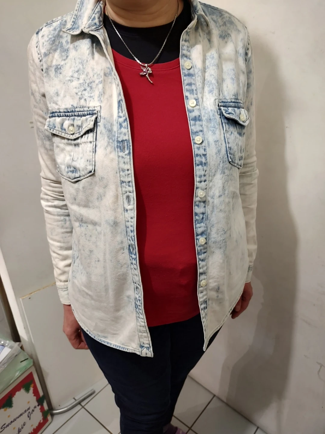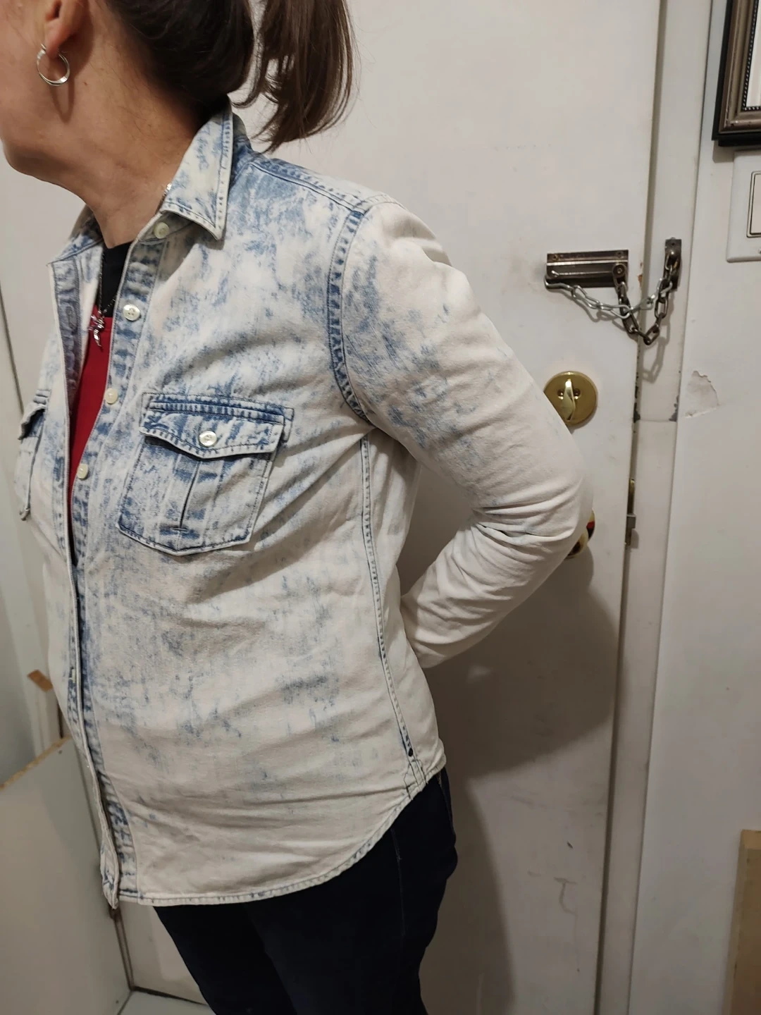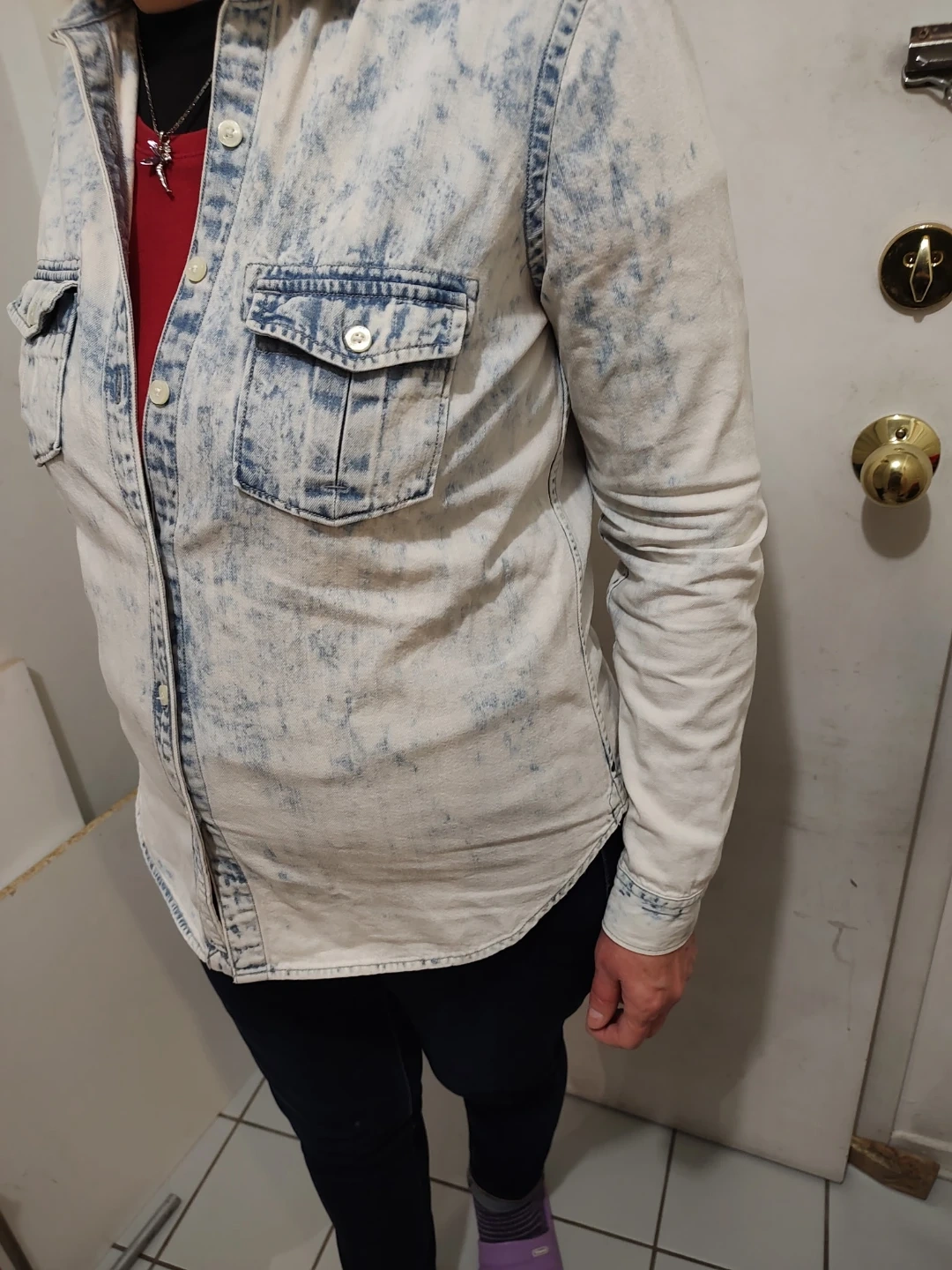 I'm selling an acid wash denim shirt! It has a unique, faded look and classic button-down style. Perfect for casual wear or layering. In great condition!