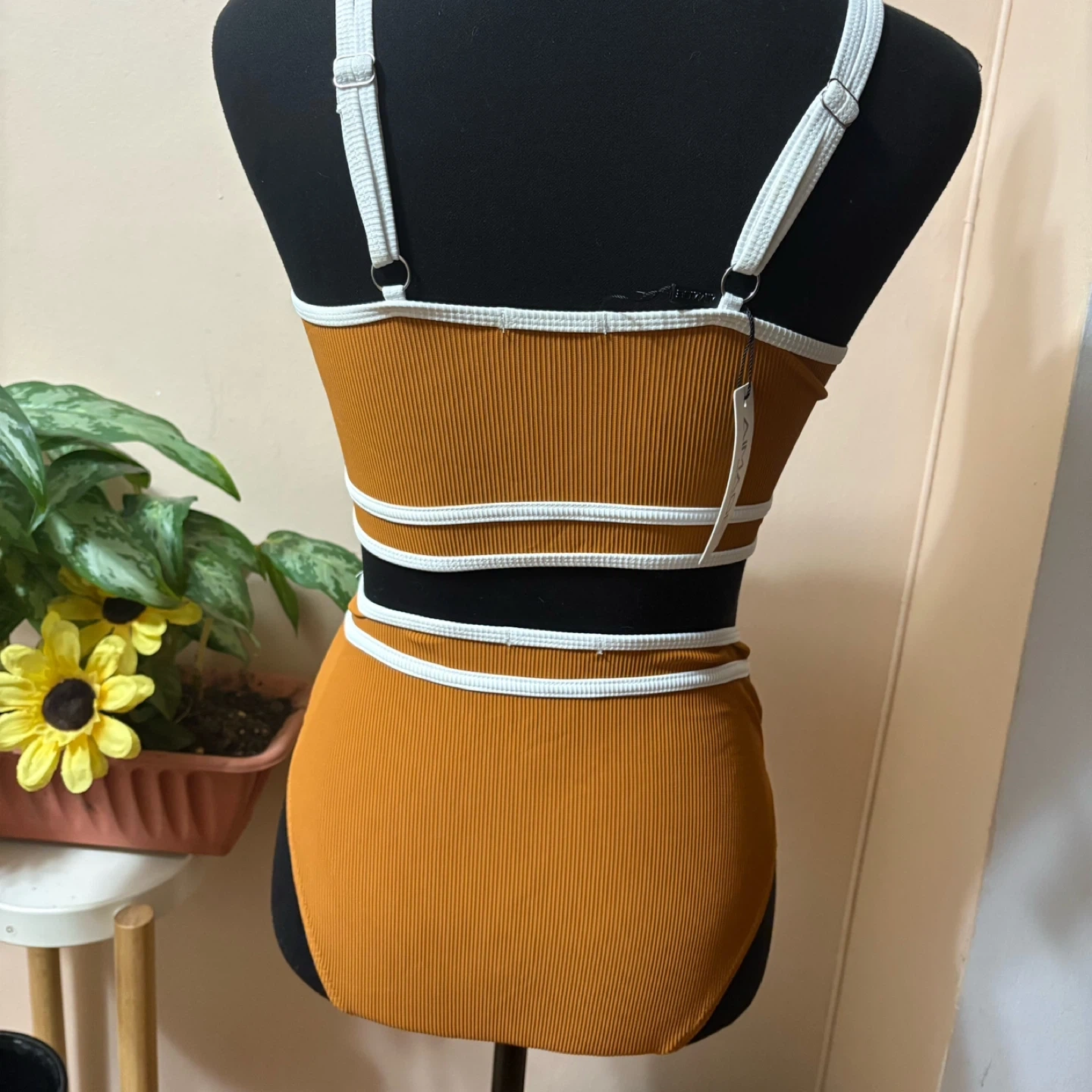 This AIMAGE bikini set comes in a ribbed fabric. It's a size small and features a stylish orange color with white trim. It's a two-piece swimsuit.