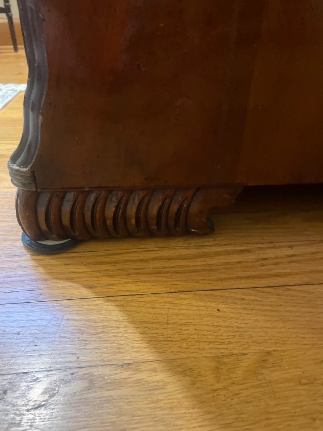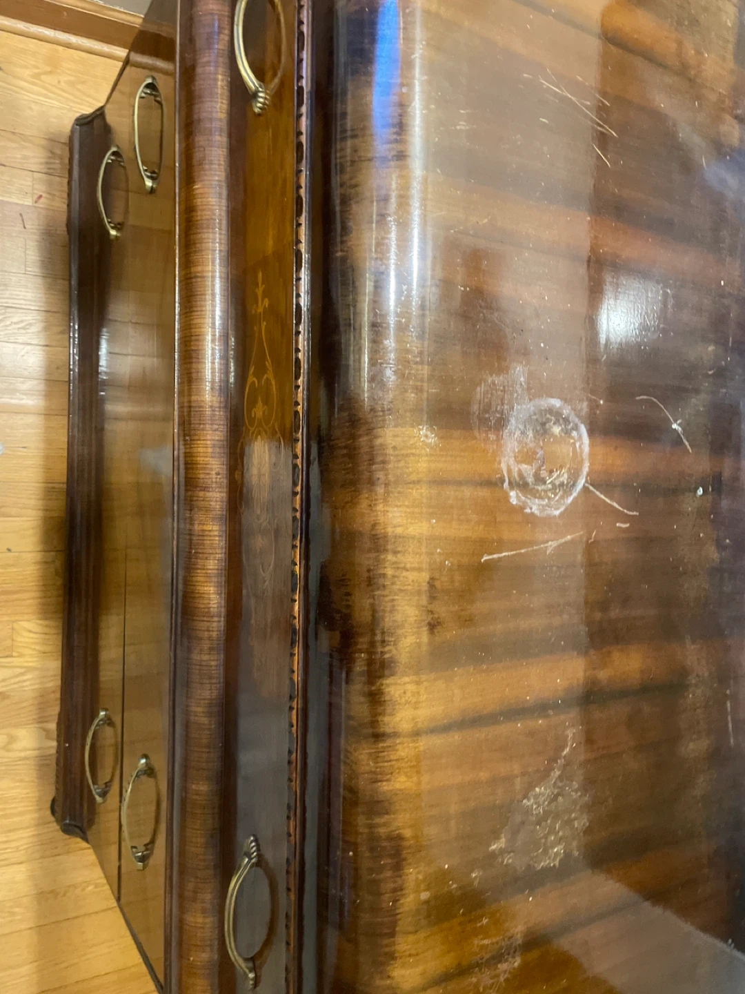 This vintage dresser features a rich wood finish and elegant brass pull handles. It has a chevron pattern on the lower drawers and decorative inlay on the top drawer. The joinery appears to be dovetail construction.