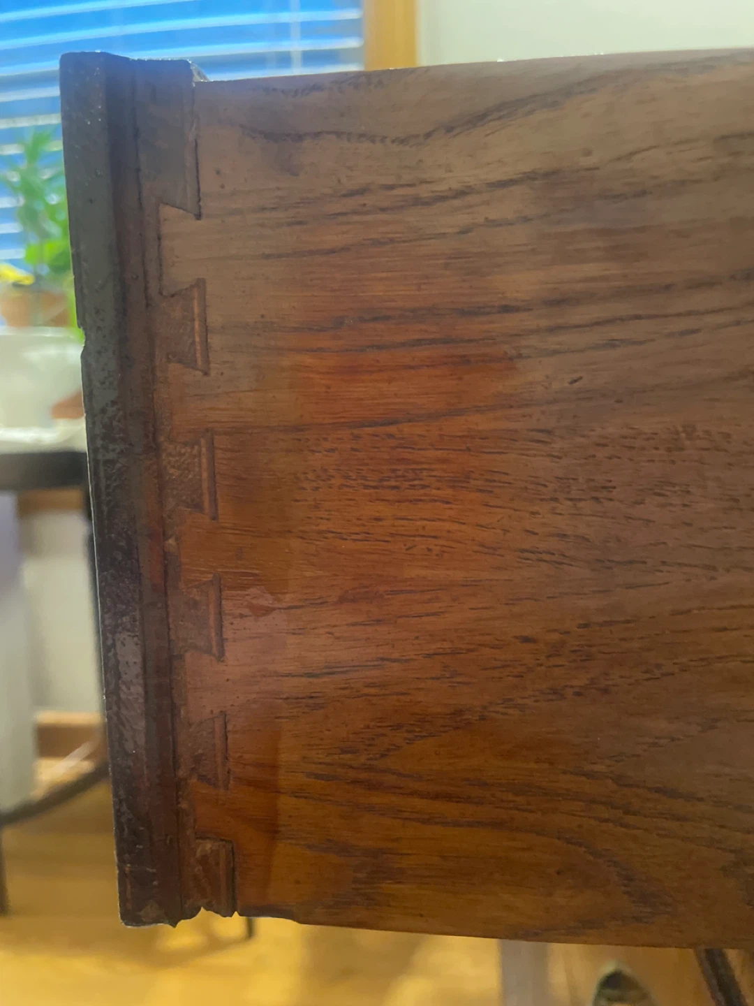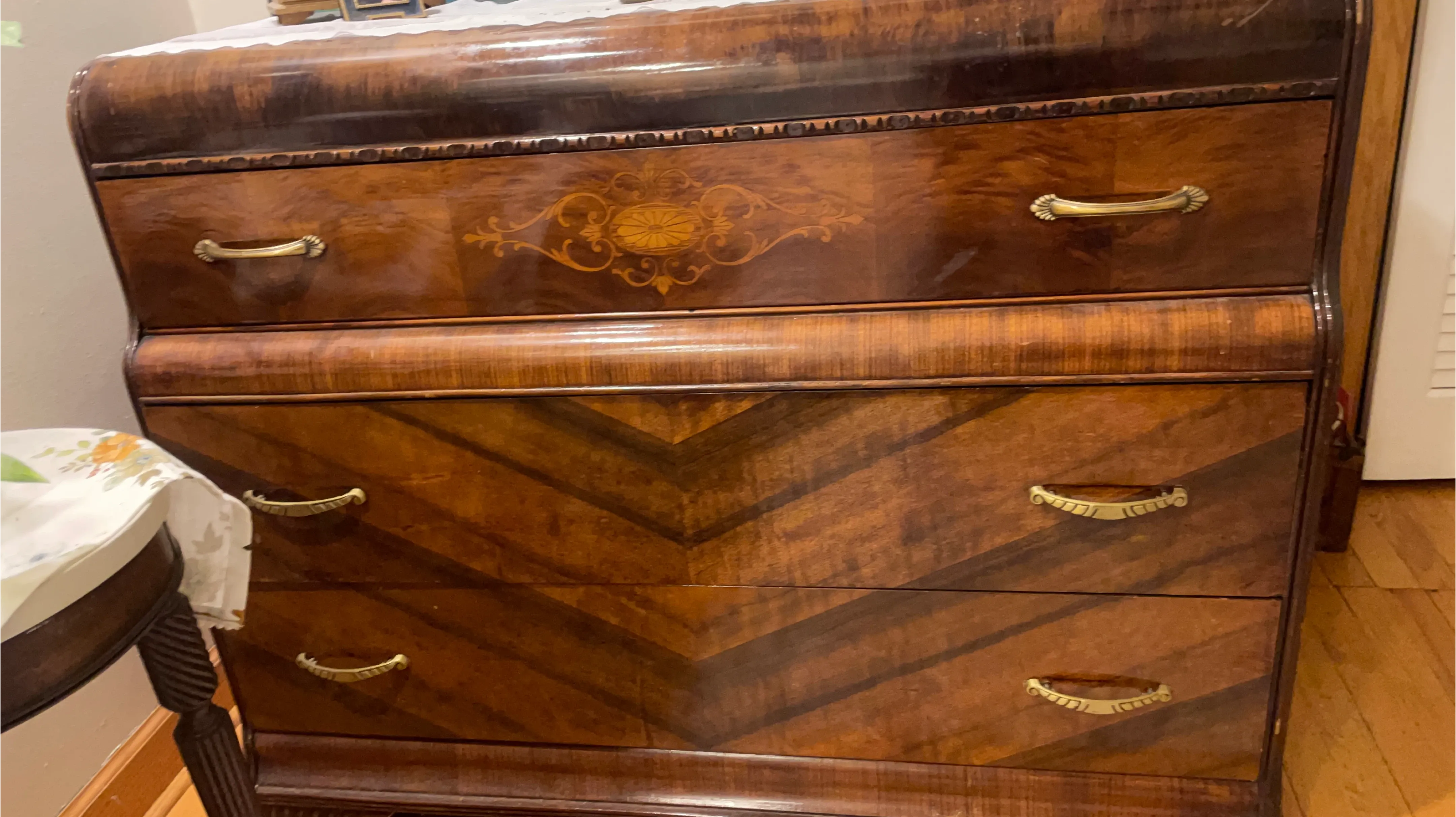 This vintage dresser features a rich wood finish and elegant brass pull handles. It has a chevron pattern on the lower drawers and decorative inlay on the top drawer. The joinery appears to be dovetail construction.