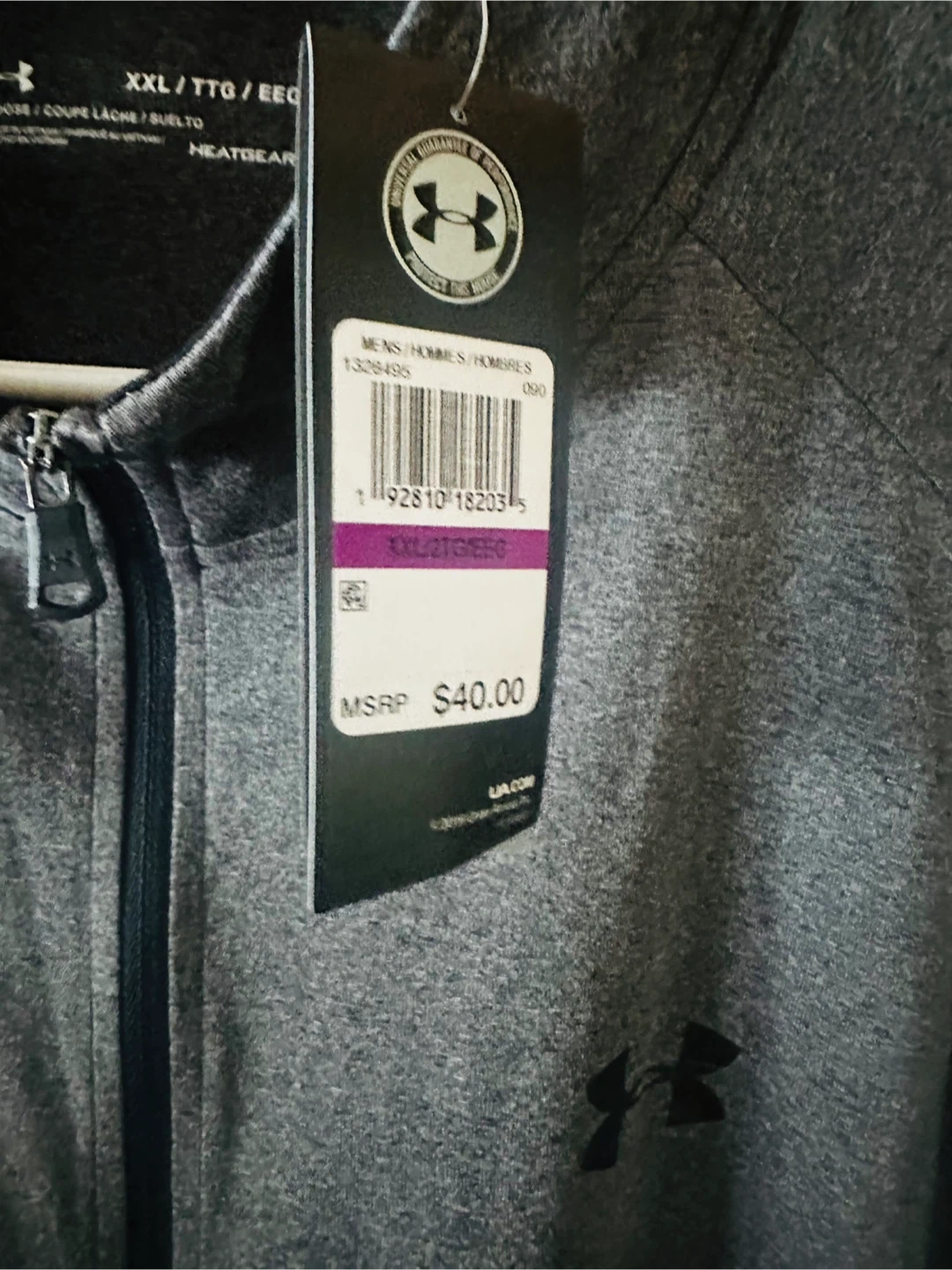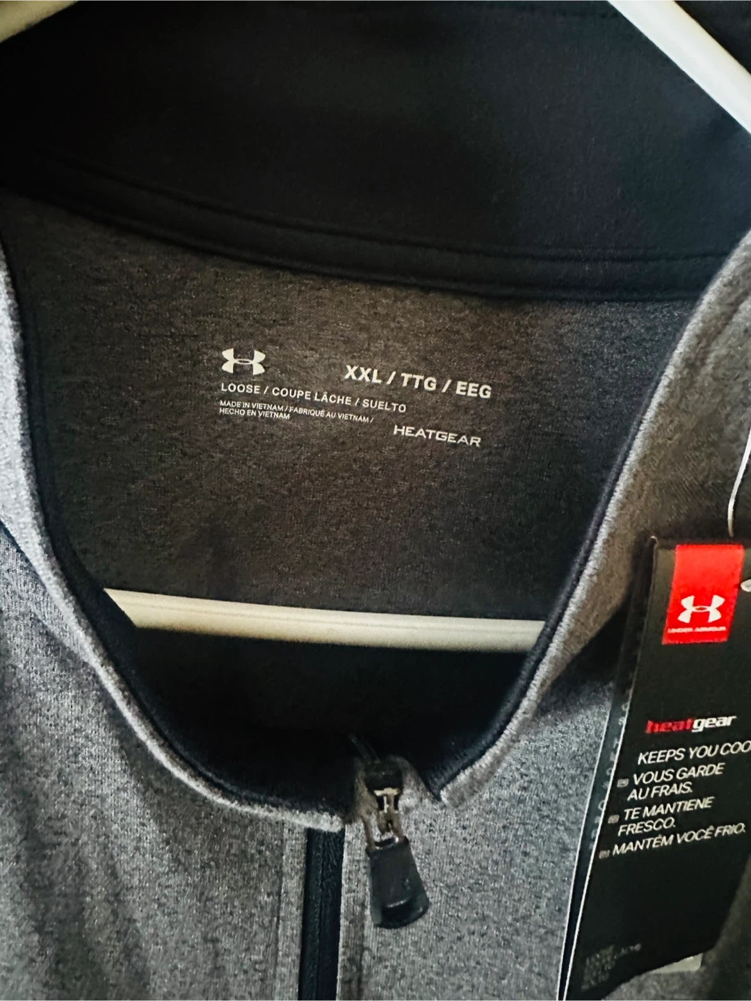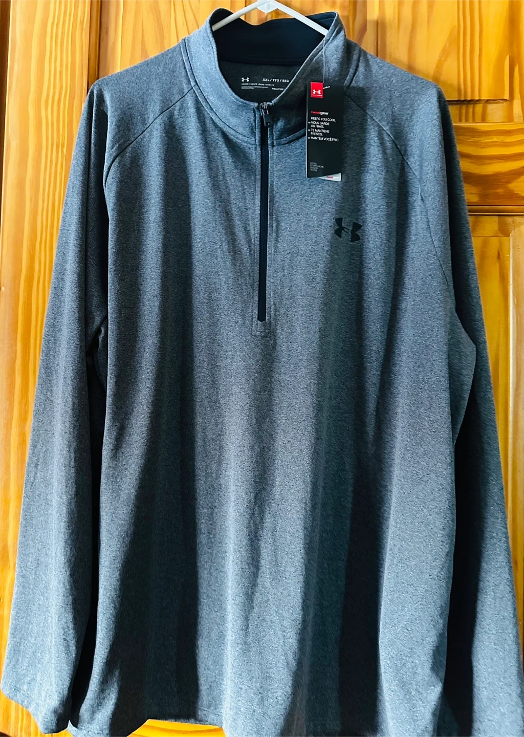 This Under Armour 1/2 zip pullover is in XXL size and gray color. It's made of 100% polyester and features HeatGear technology to help regulate body temperature. Great for workouts or casual wear!