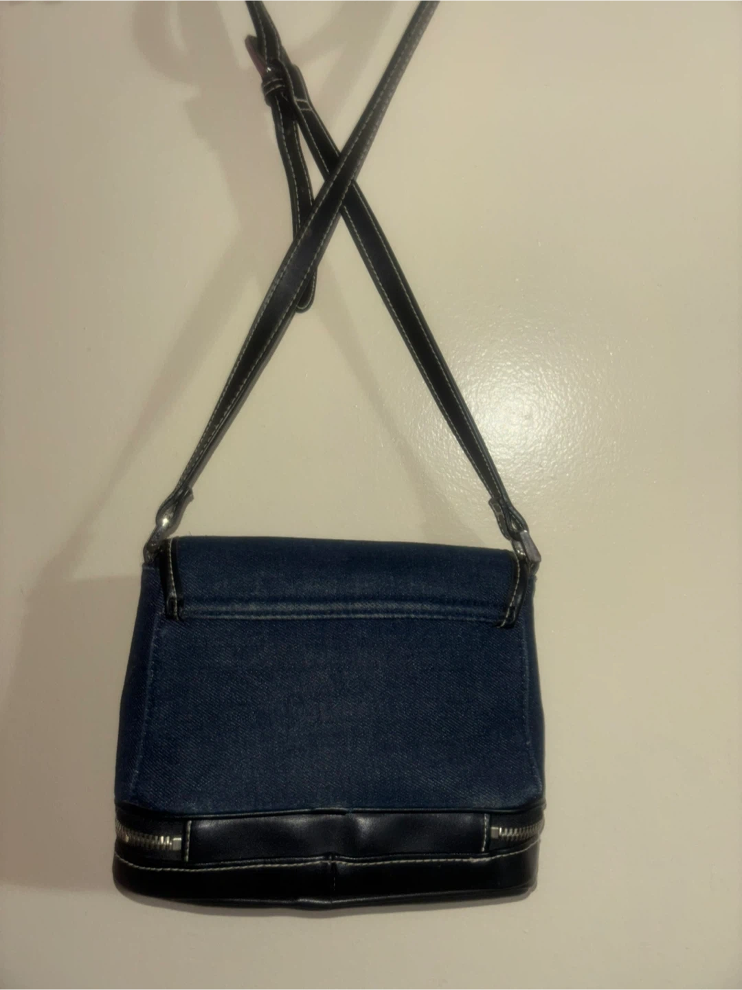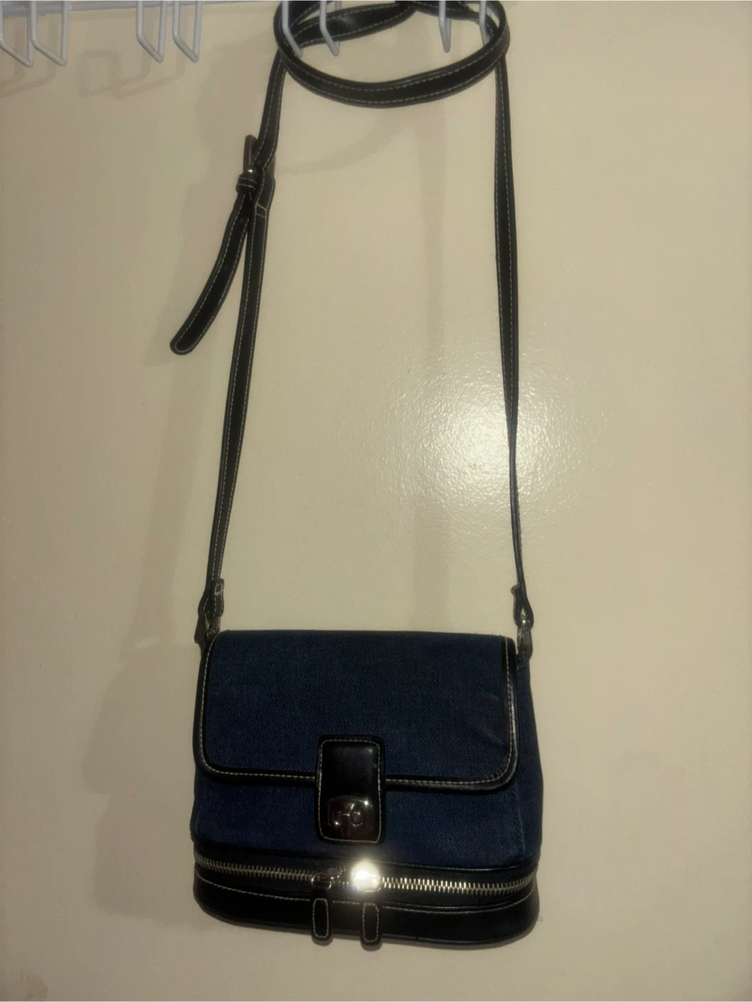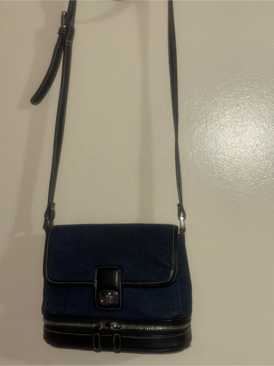 This crossbody bag features a dark denim body with black faux leather trim and silver hardware. It has a fold-over flap with a clasp closure and a zippered compartment at the bottom. The adjustable strap is made of black faux leather.