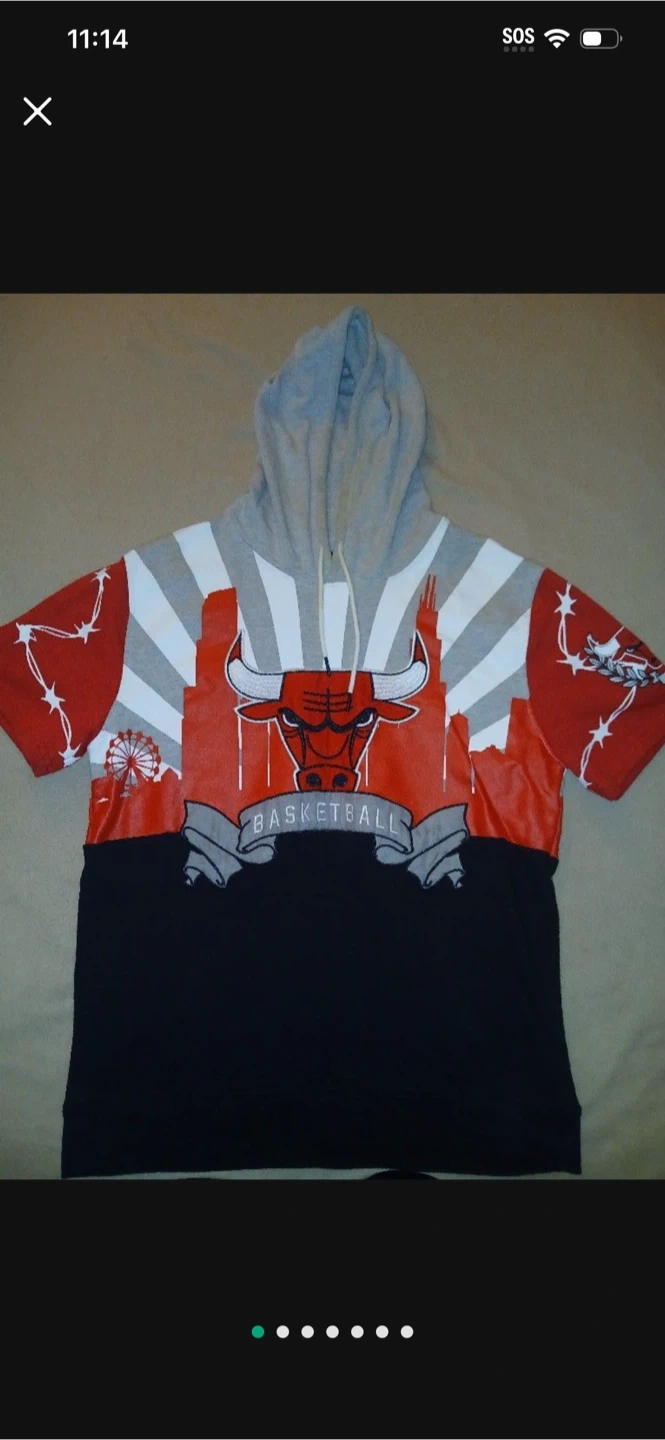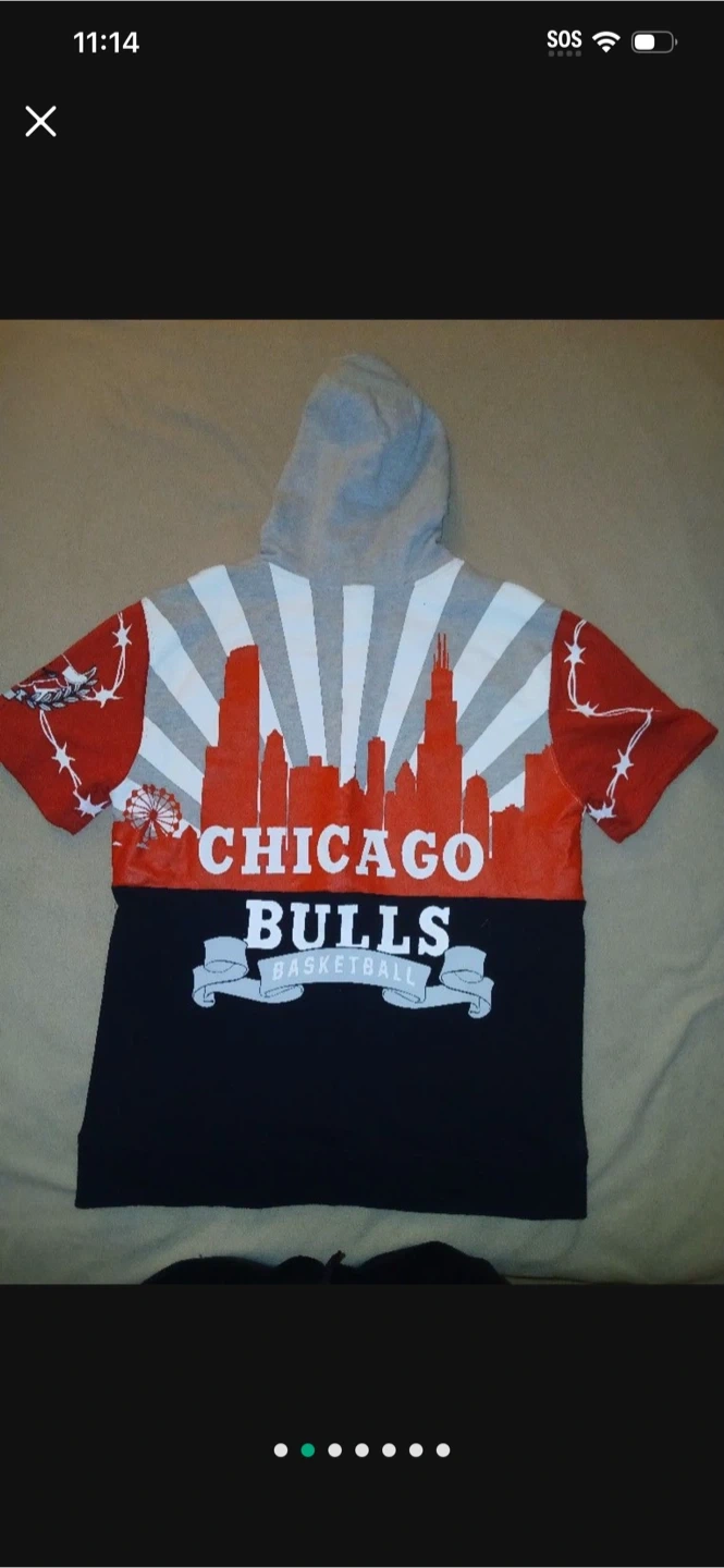 Selling a Chicago Bulls basketball hoodie! It features a unique design with the Chicago skyline and the Bulls logo. The hoodie has short sleeves and a gray hood. Perfect for any Bulls fan!