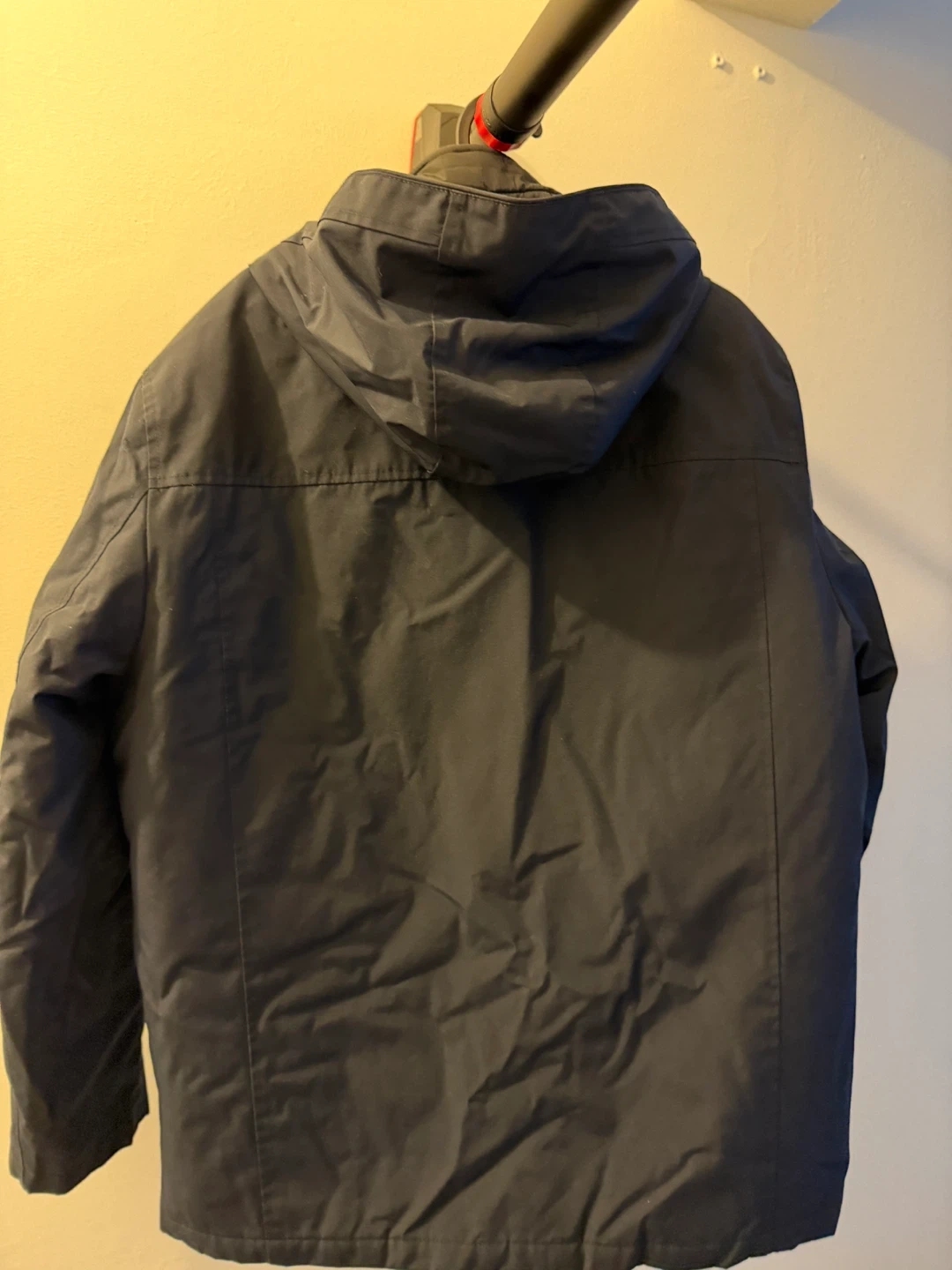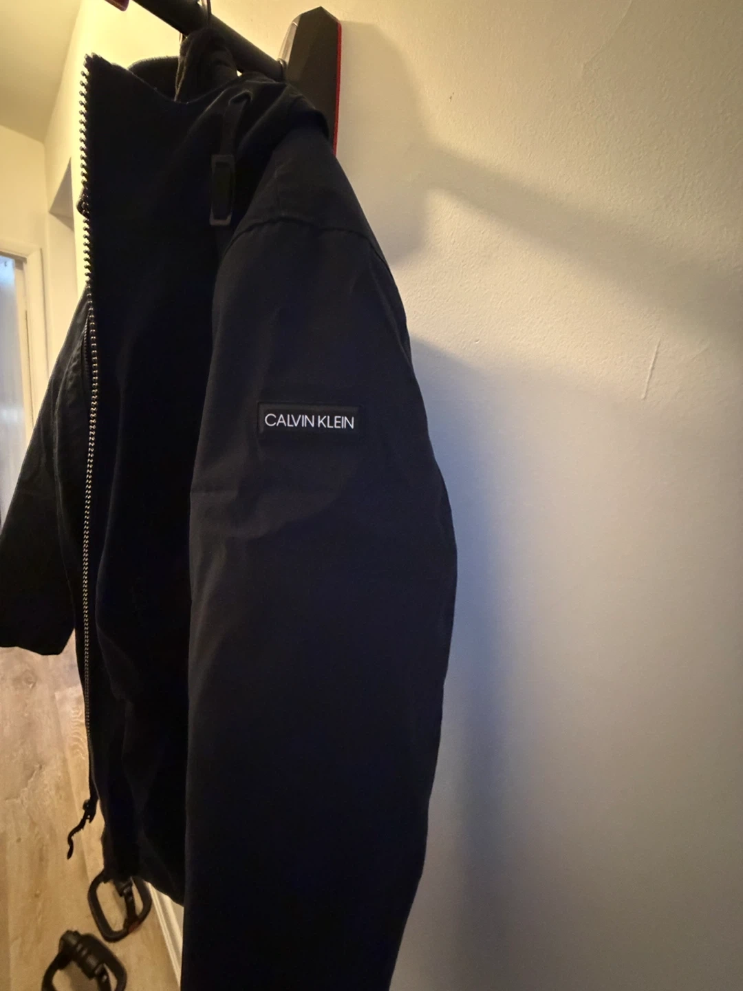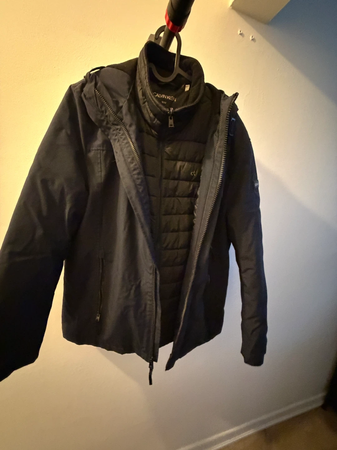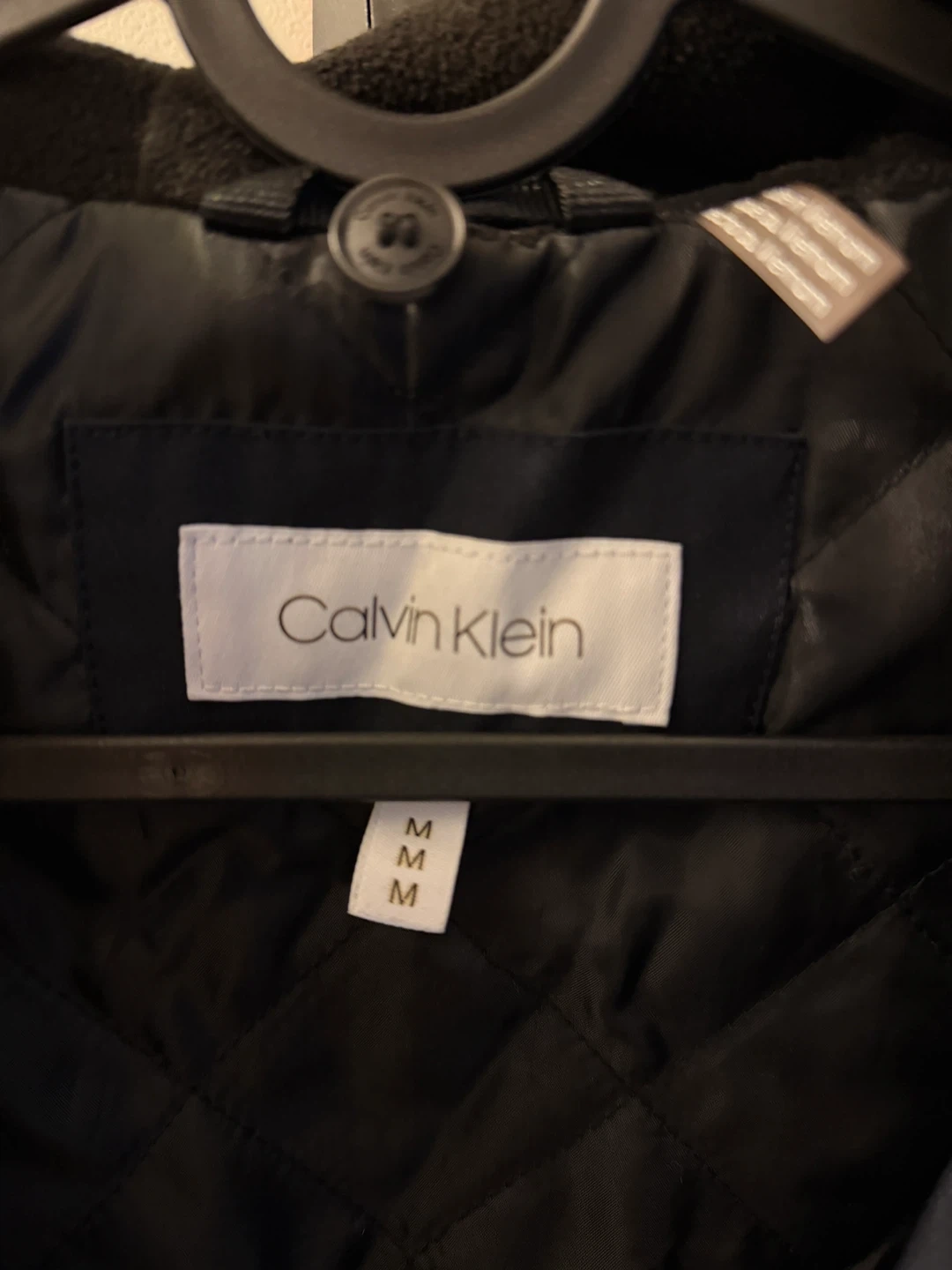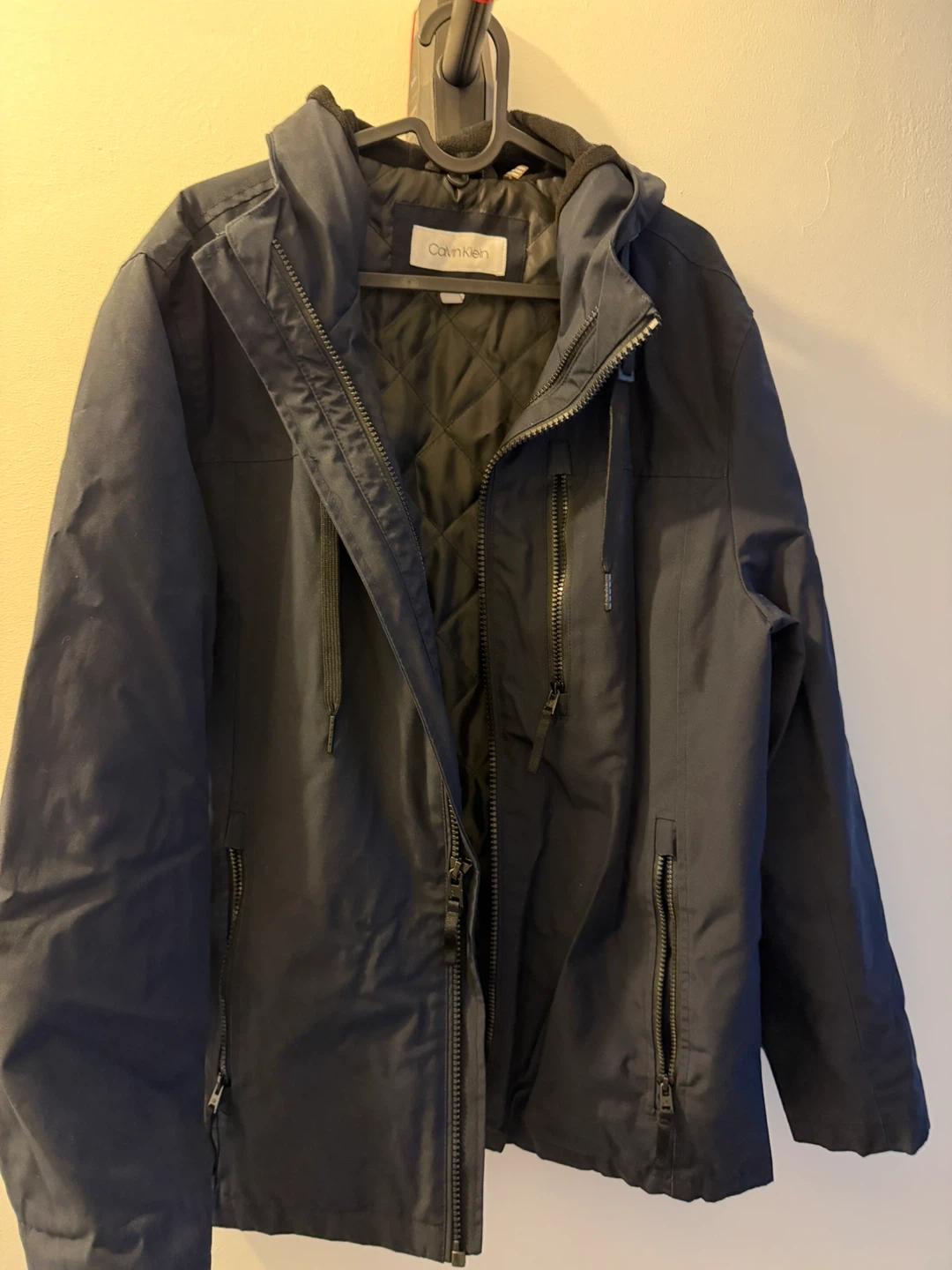 Navy blue Calvin Klein hooded jacket. It's a size medium with a quilted inner lining. Lots of zippered pockets on this one! It’s a 2 in 1 jacket. Barely used.