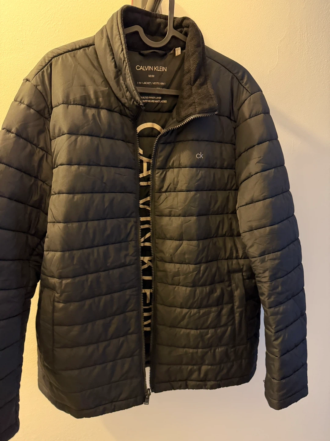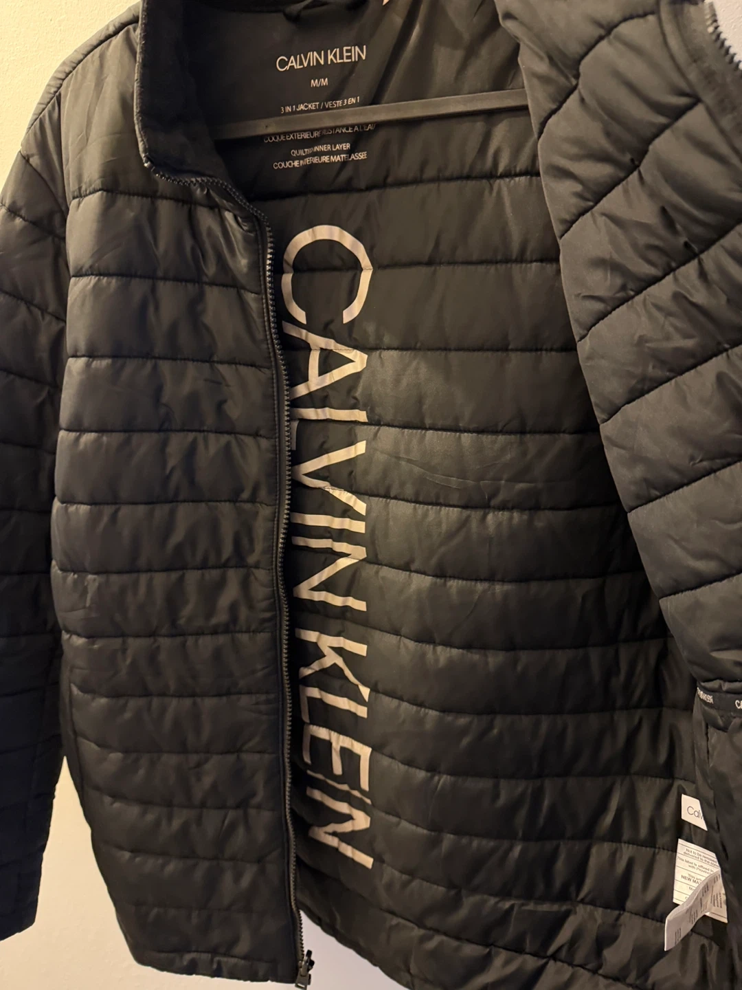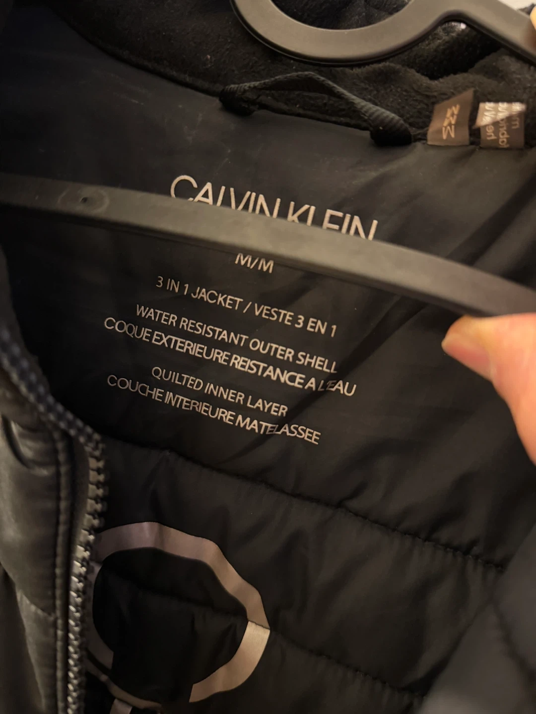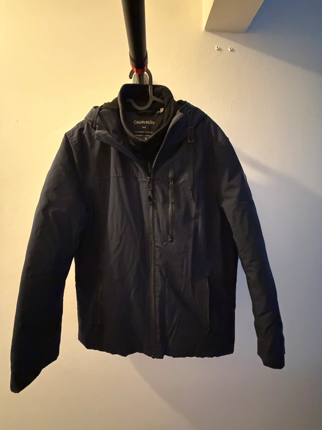 Navy blue Calvin Klein hooded jacket. It's a size medium with a quilted inner lining. Lots of zippered pockets on this one! It’s a 2 in 1 jacket. Barely used.