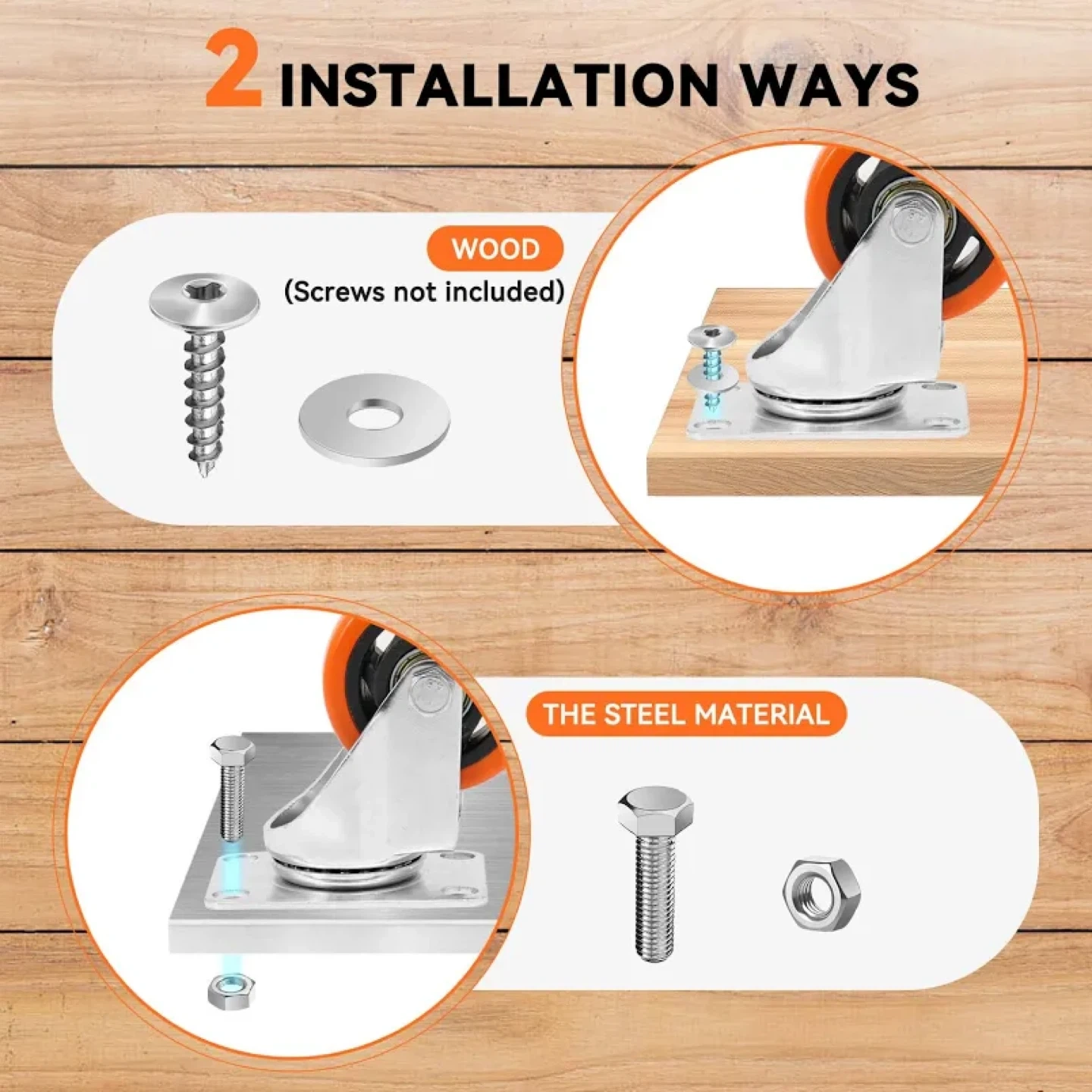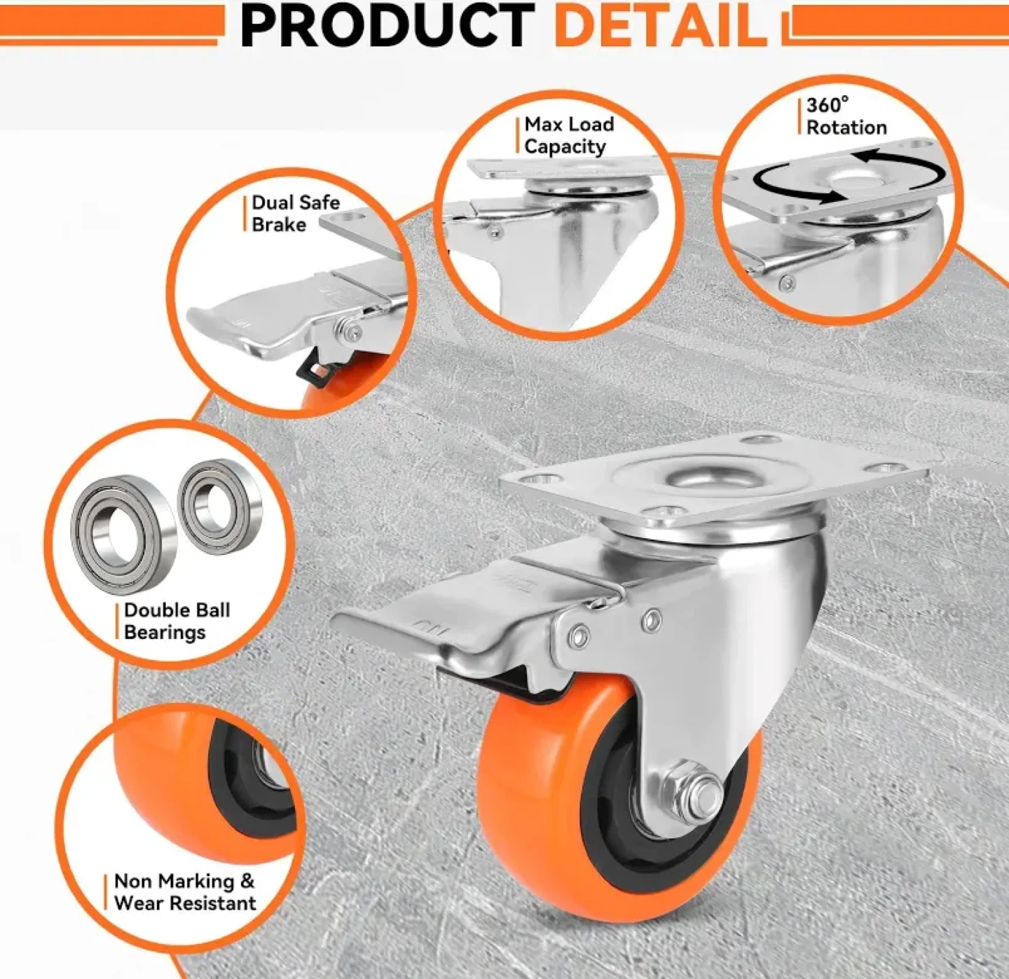 Four orange, heavy-duty swivel caster wheels. Each wheel has a brake for secure stopping. Steel material construction. Supports up to 1000 lbs per set. Great for furniture or equipment.