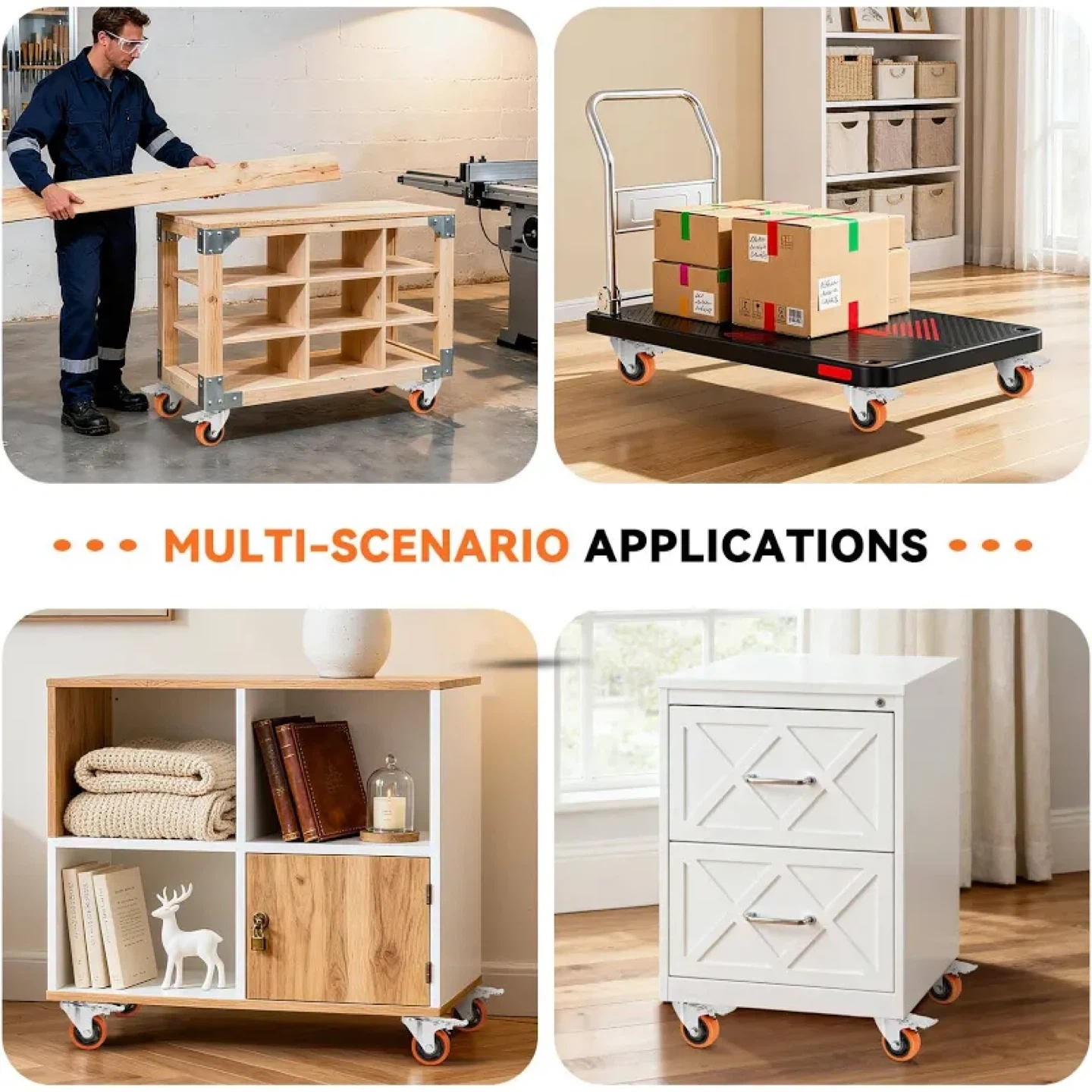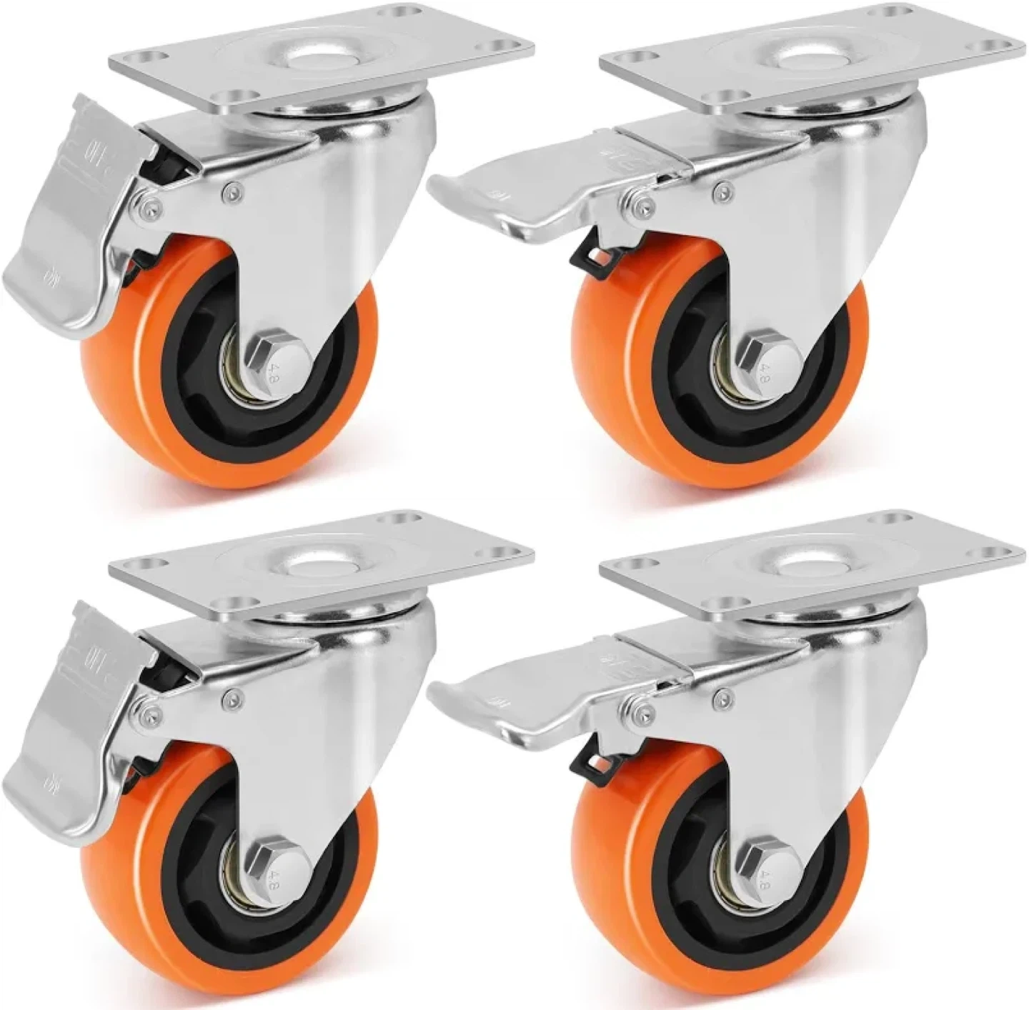 Four orange, heavy-duty swivel caster wheels. Each wheel has a brake for secure stopping. Steel material construction. Supports up to 1000 lbs per set. Great for furniture or equipment.