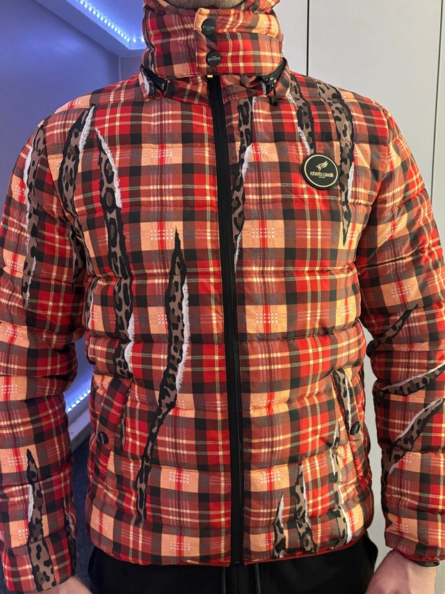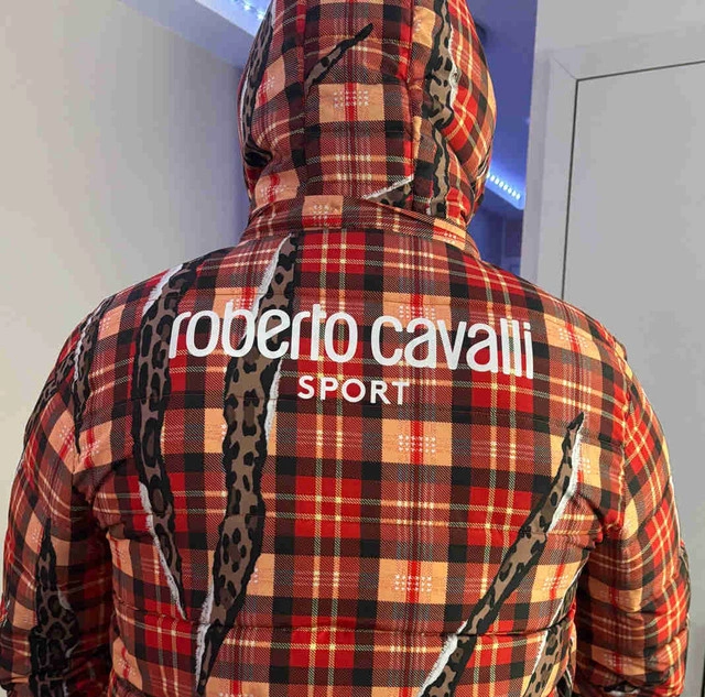 Elevate your style with this eye-catching Roberto Cavalli Sport puffer jacket, featuring a bold red plaid pattern accented with unique leopard-print claw mark designs. This jacket was bought and gifted in Europe, never was worn.