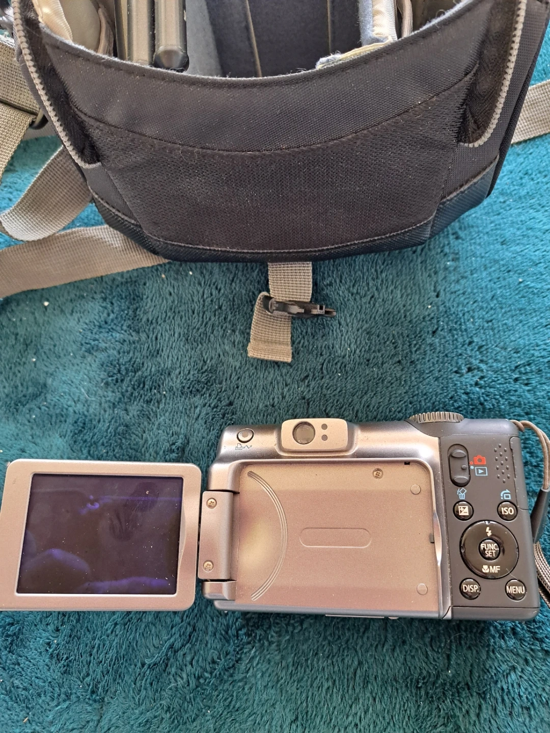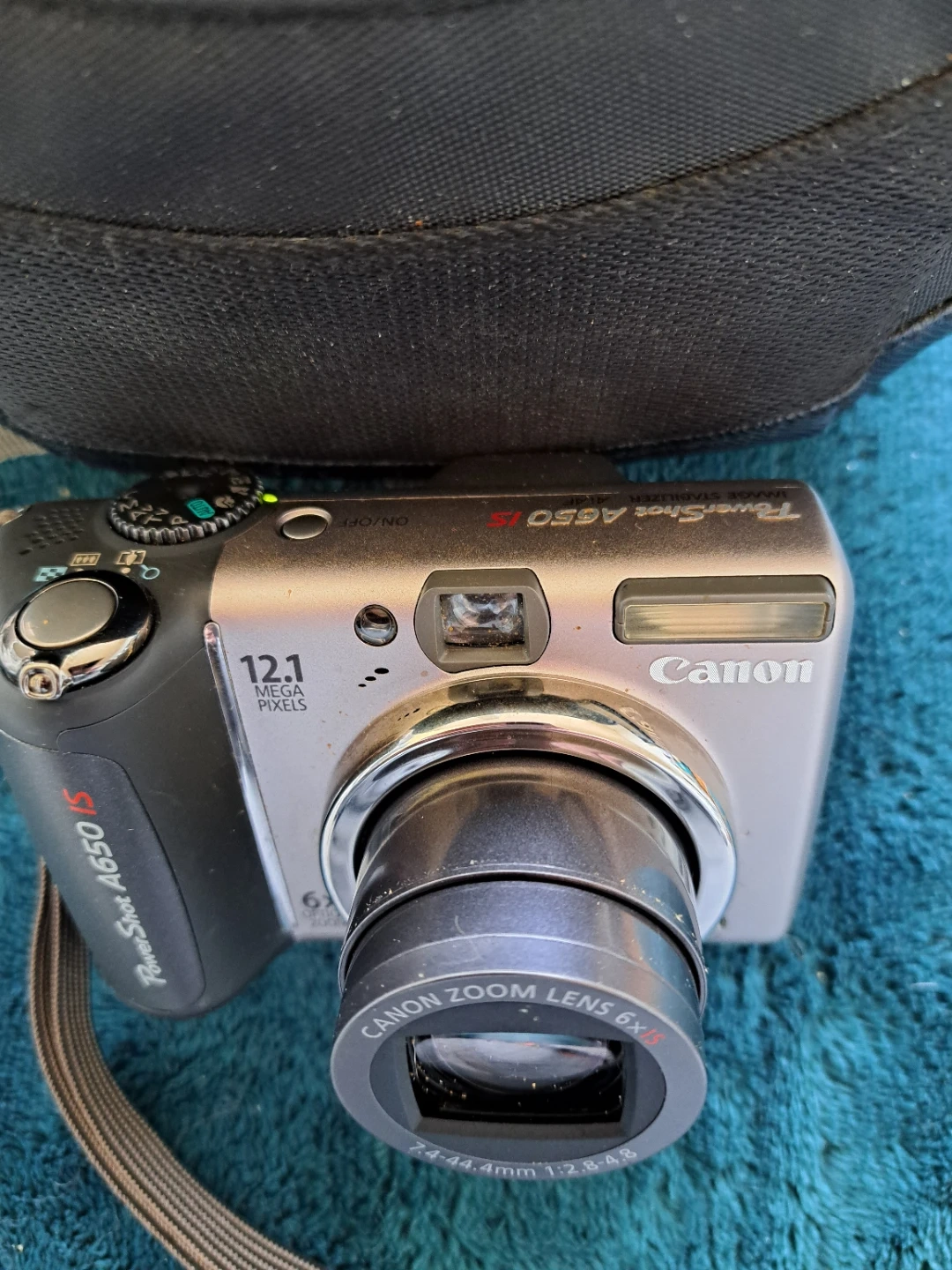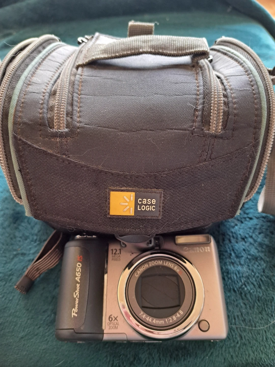 Canon PowerShot A650 IS digital camera with 12.1 megapixels and 6x optical zoom. Includes a Case Logic camera bag and a Targus mini tripod. The camera features image stabilization.