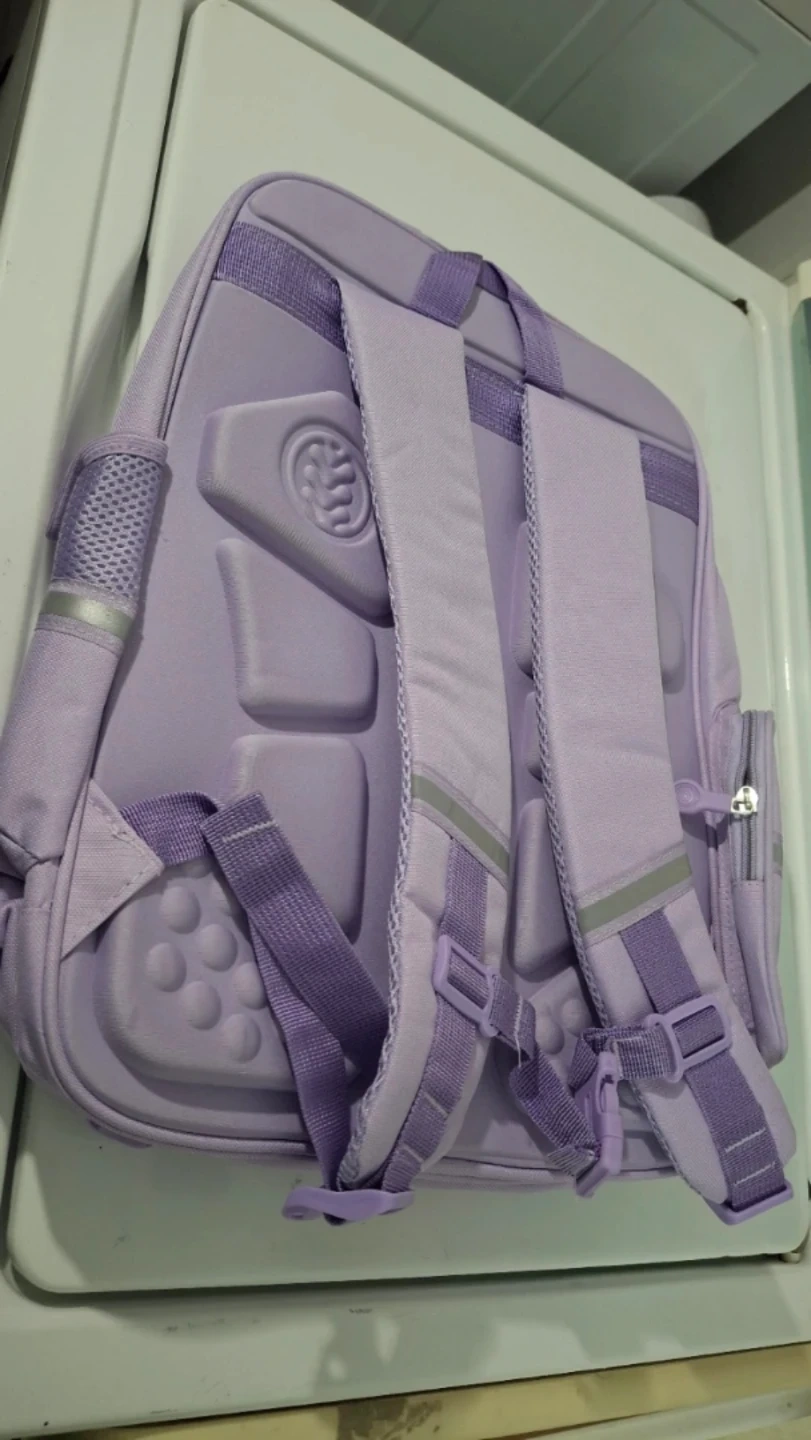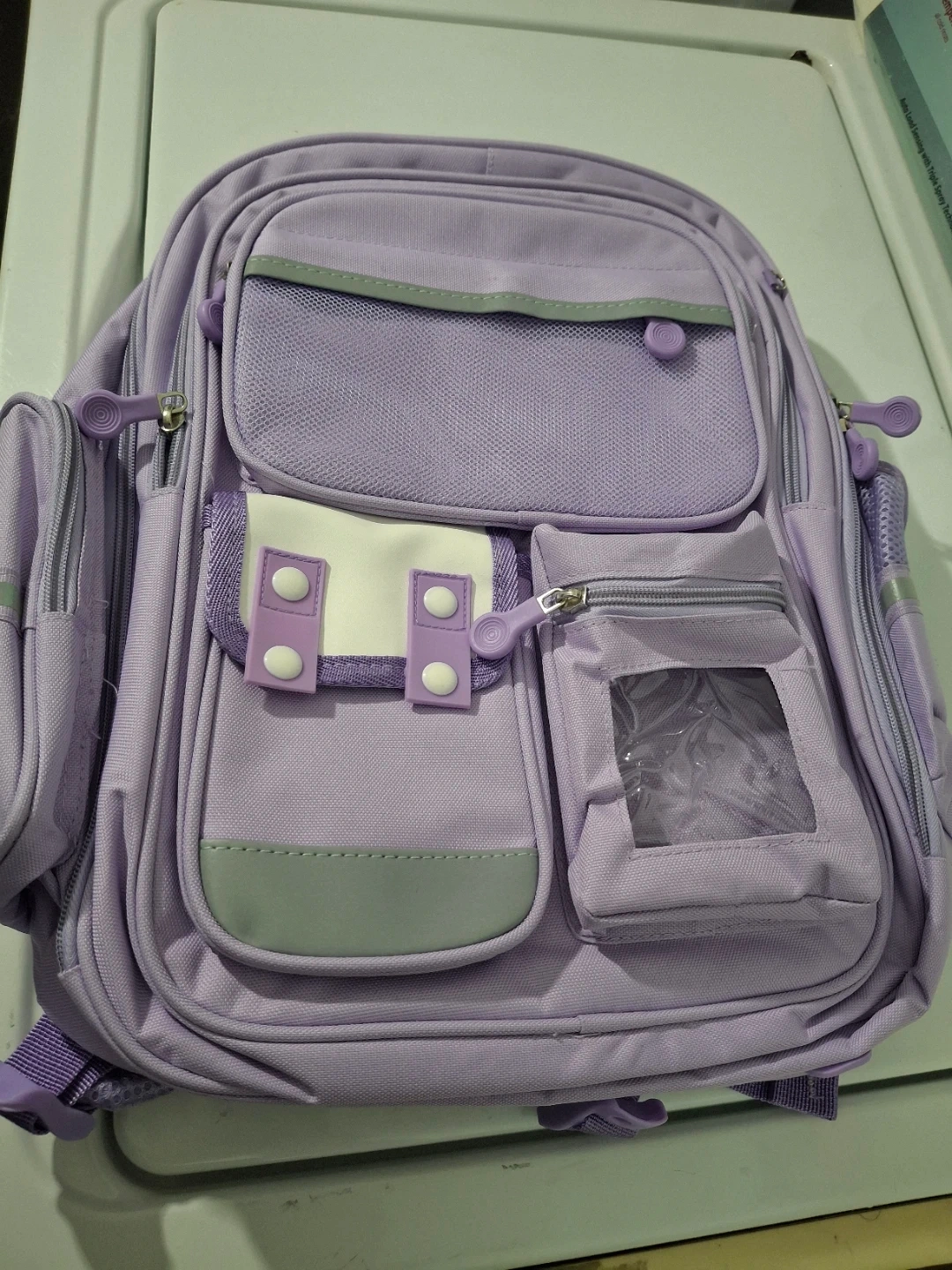 This purple backpack has multiple compartments and pockets for organization. It's made from durable fabric with padded shoulder straps for comfort. Great for school or travel!