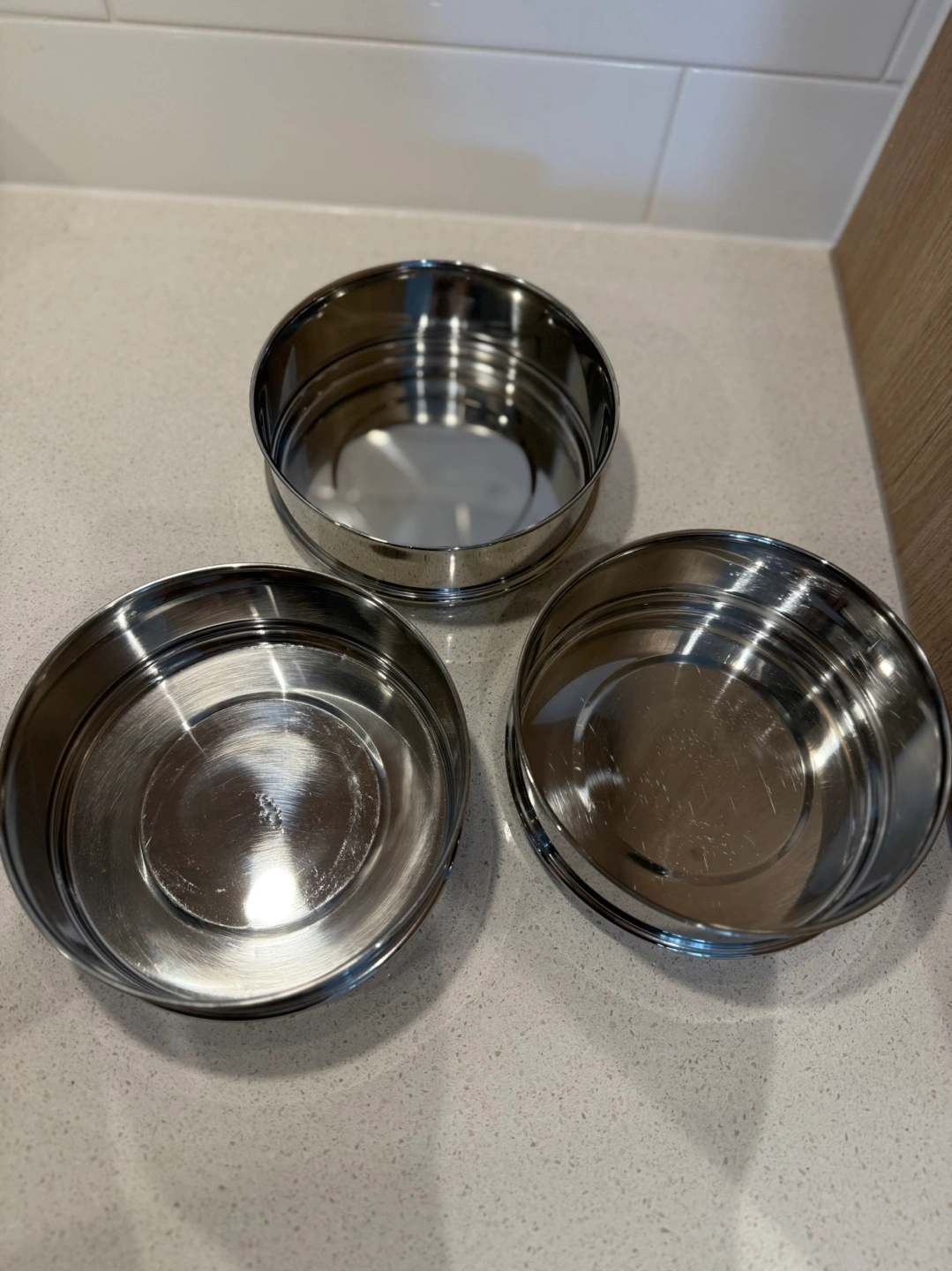 Three stainless steel stackable inserts for Instant Pot or Pressure Cooker. Perfect for cooking multiple things together.