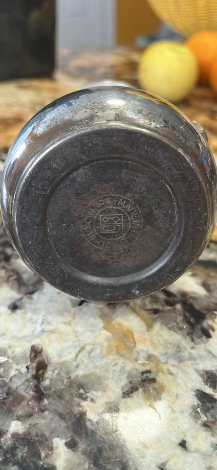 The body is made of 18/10 stainless steel, and the handle and knob are plated with 24kt gold. It's a beautiful piece that also makes a great cup of espresso!