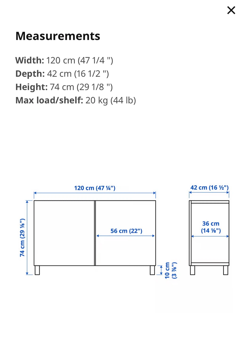 - Max load/shelf: 20 kg (44 lb)