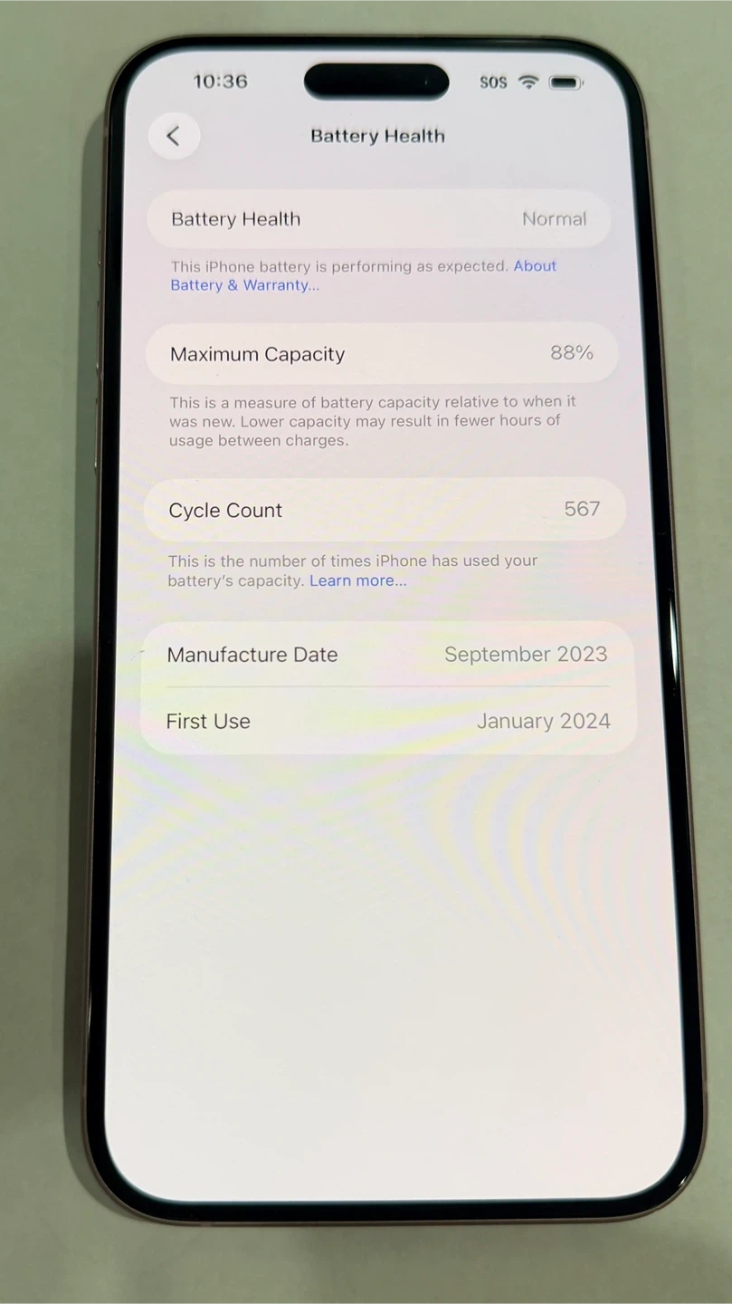 This is a pink Apple iPhone 13. Maximum capacity is 88%. Manufactured in September 2023, first used in January 2024.