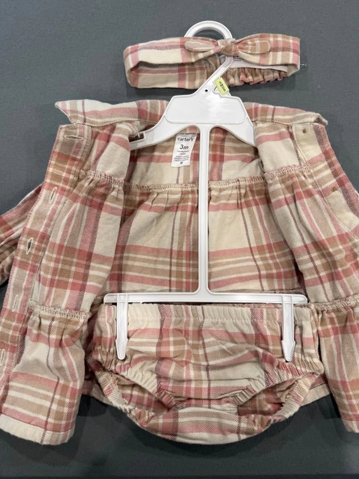 Gently used Carter's plaid dress, size 3 months. Only worn once at Thanksgiving. Perfect for Christmas! Includes dress, bloomers, and bow. Bloomers and bow are brand new, never worn. Still available on Carter's website. Asking $15 OBO.