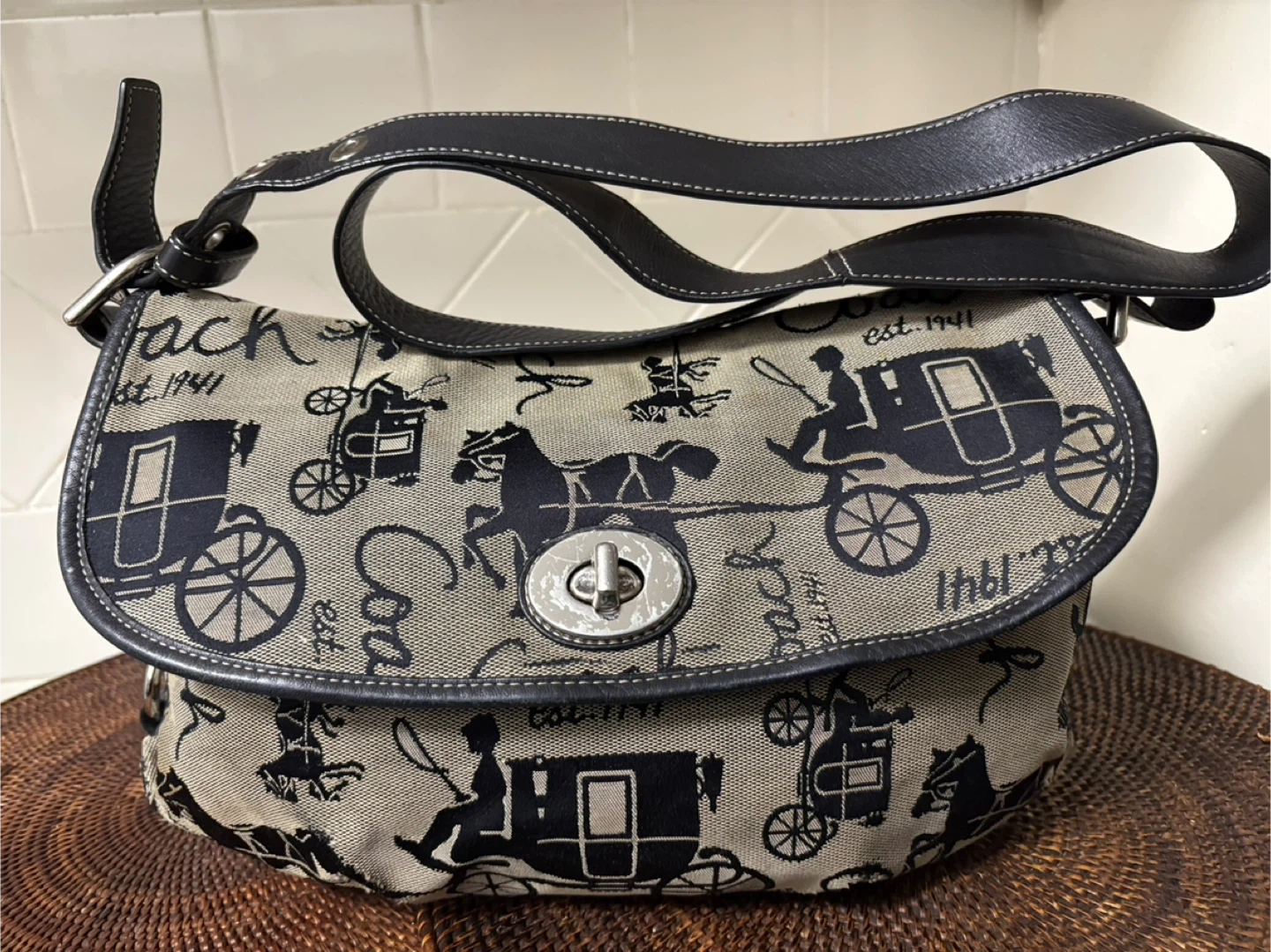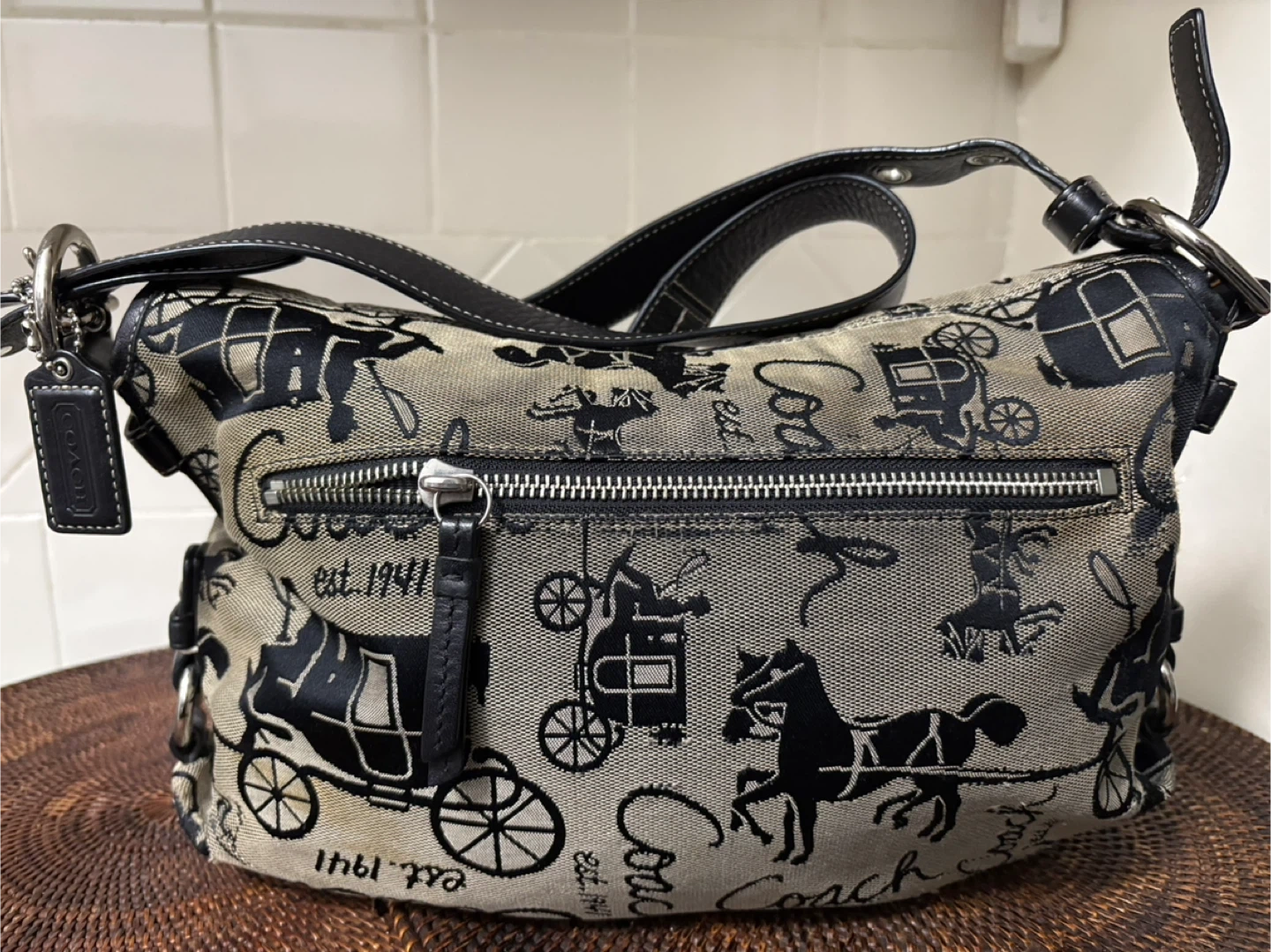 This is a stylish Coach hobo bag with the signature "C" pattern and a carriage and horse design. It features a turn-lock closure on the flap and a zippered pocket on the front. The interior is spacious and perfect for everyday use.