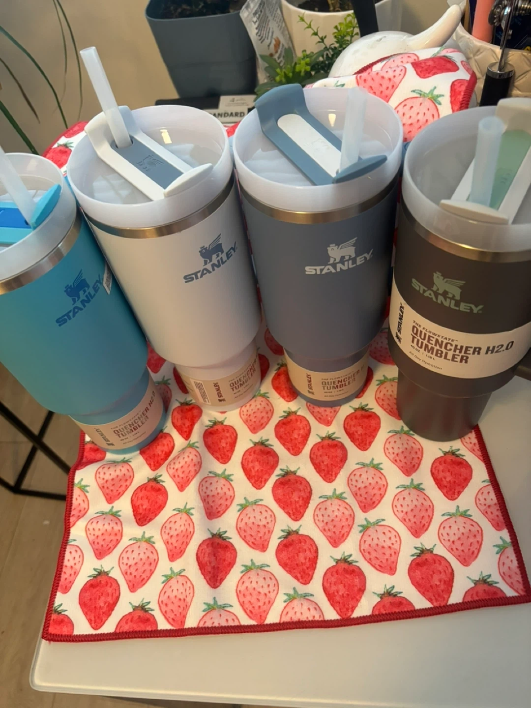 Set of four Stanley Quencher H2.0 tumblers in assorted colours. Each tumbler is 40 oz and comes with a straw. Stainless steel construction for all-day hydration.