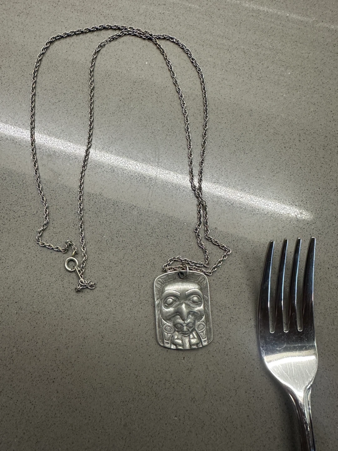 A beautiful vintage Haida pewter pendant necklace. Eagle protecting man. 30yrs old from B.c
