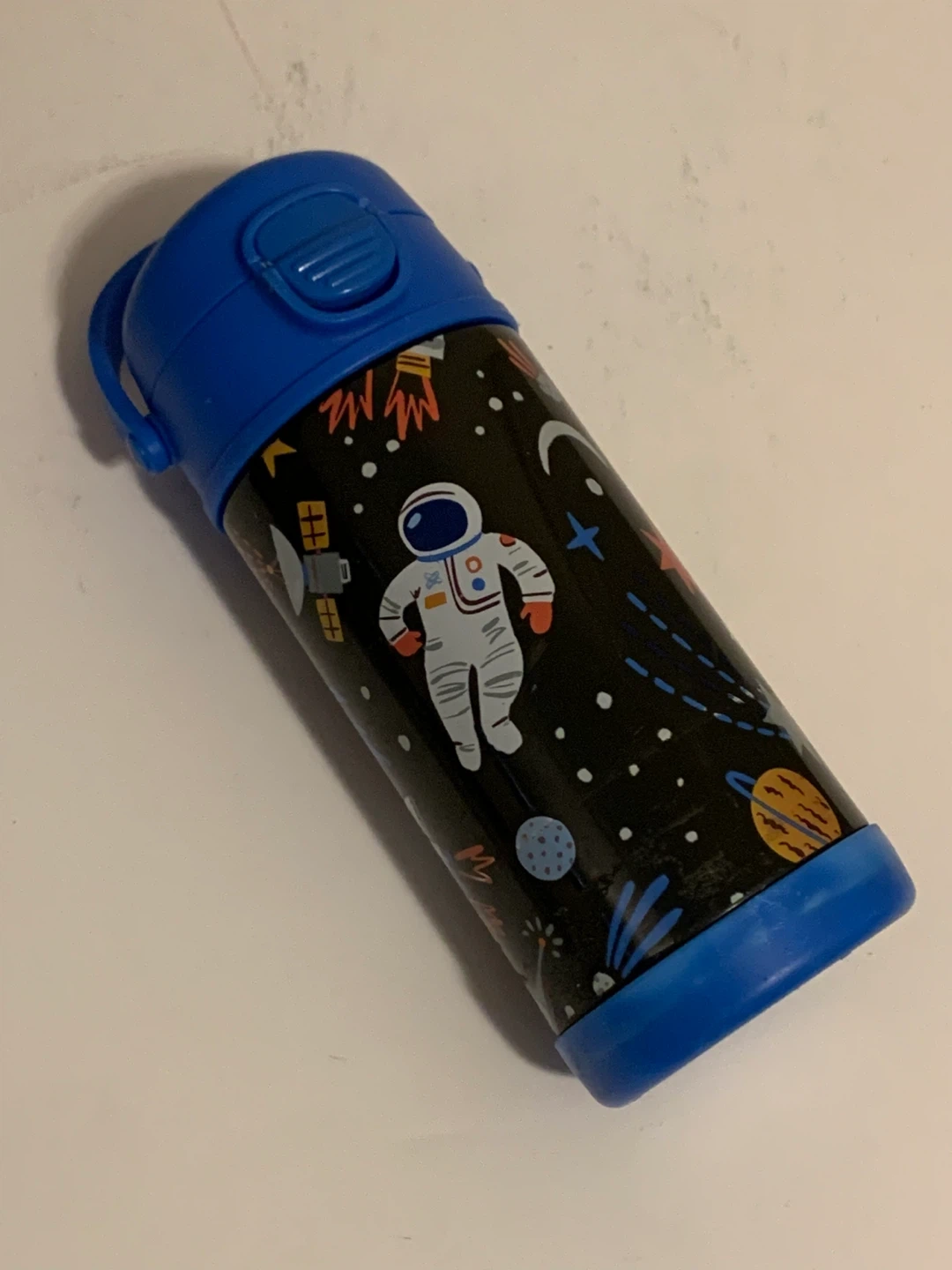 This colourful kids' water bottle features an astronaut and space design. It includes a flip-top lid with a built-in straw for easy sipping. The bottle is designed for little adventurers on the go!
