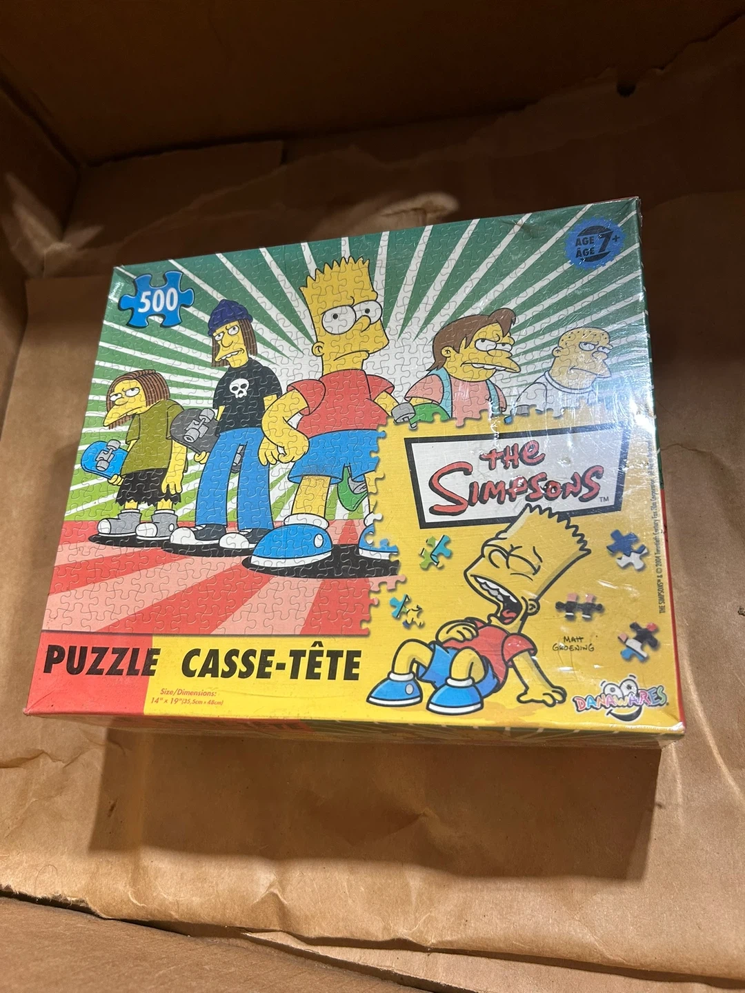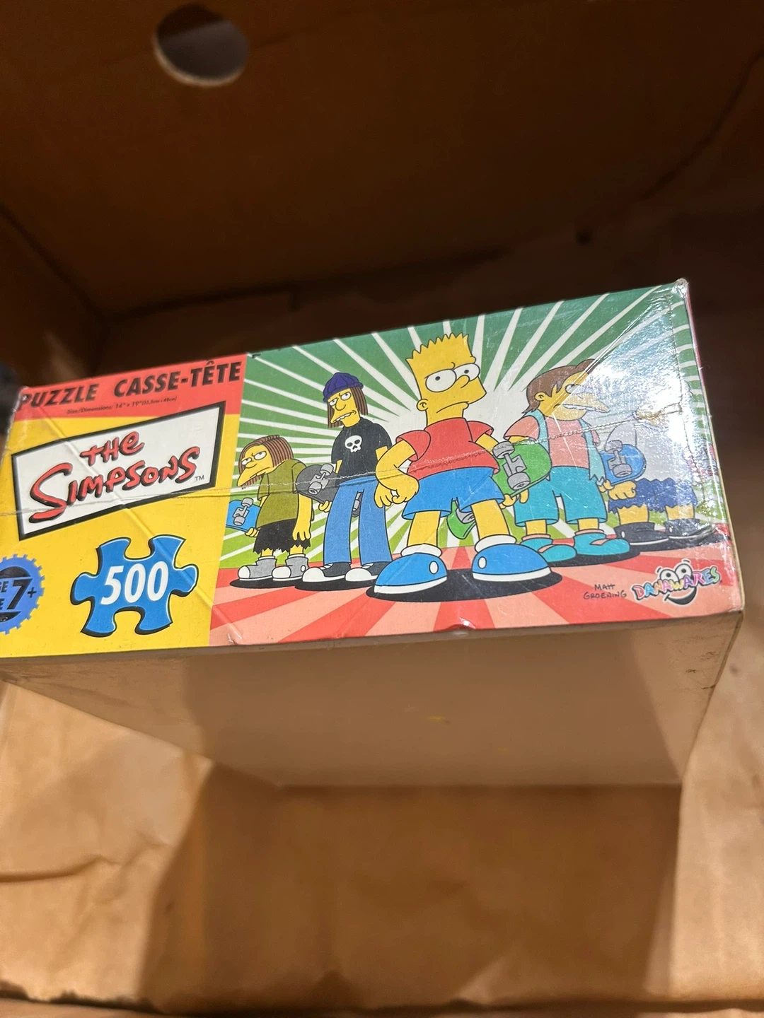 This is a 500-piece jigsaw puzzle featuring characters from The Simpsons. The puzzle dimensions are 14" x 19" (35.5 cm x 48.2 cm). It's recommended for ages 7 and up.