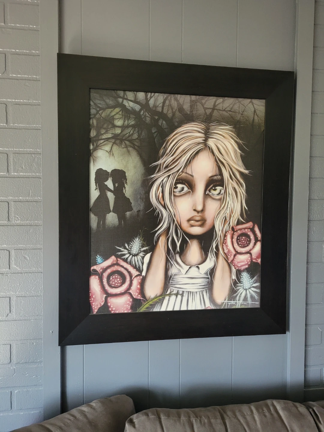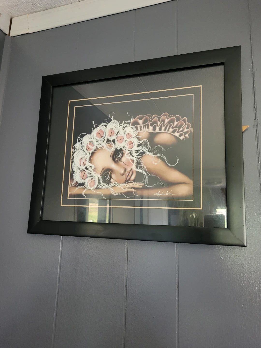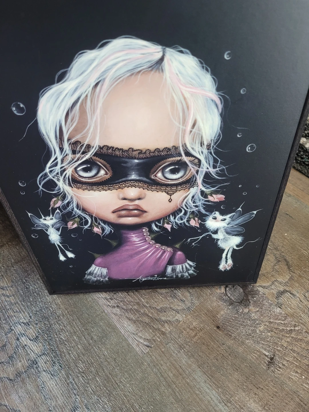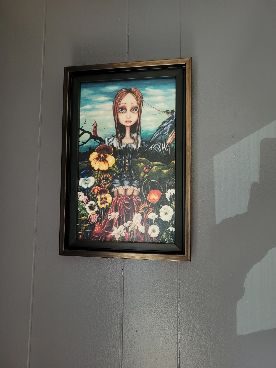 This collection features five unique framed art prints by Angelena Wrona, with a distinctive whimsical and gothic aesthetic. Each piece showcases a beautifully rendered doll-like figure with large expressive eyes, set against various atmospheric backgrounds. The prints are in different sizes and frames, adding variety to your decor. They're perfect for adding a unique touch to any room!
