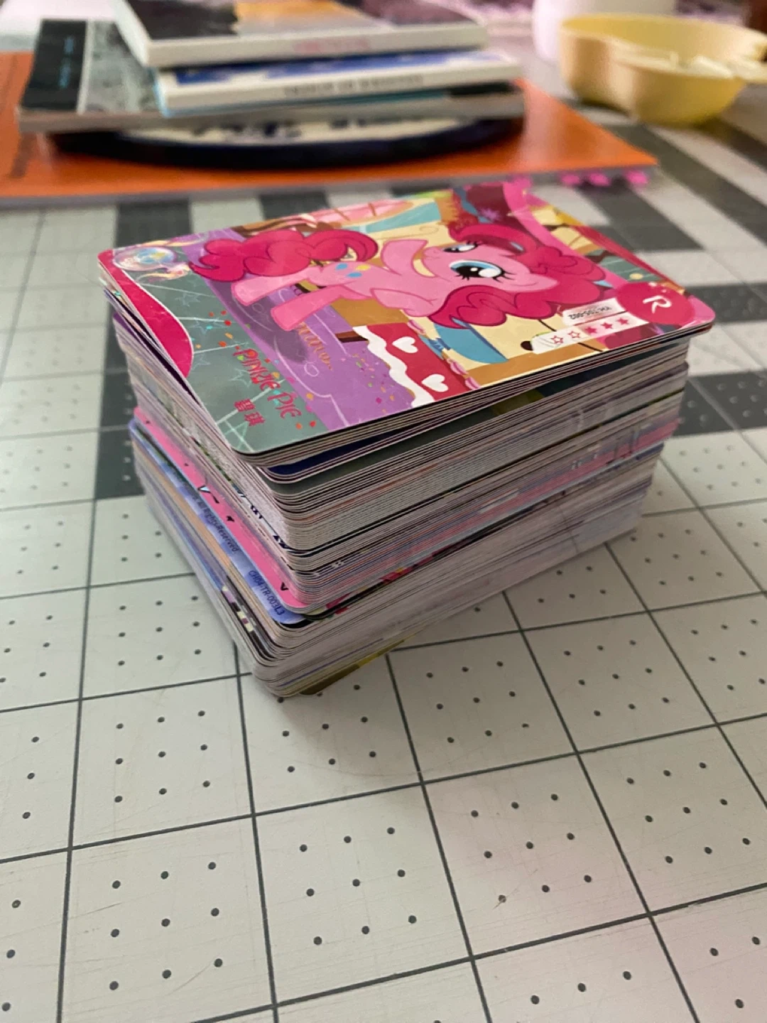 A stack of My Little Pony collectible cards featuring various characters. These cards are great for fans and collectors. Made by Hasbro.