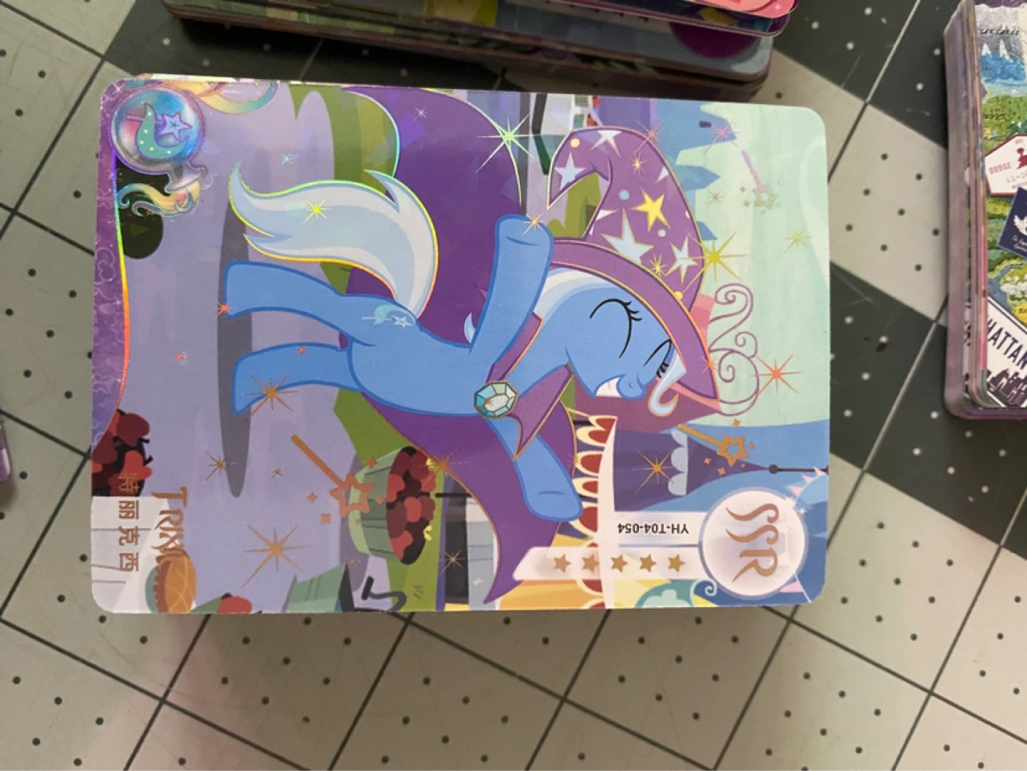 A stack of My Little Pony collectible cards featuring various characters. These cards are great for fans and collectors. Made by Hasbro.