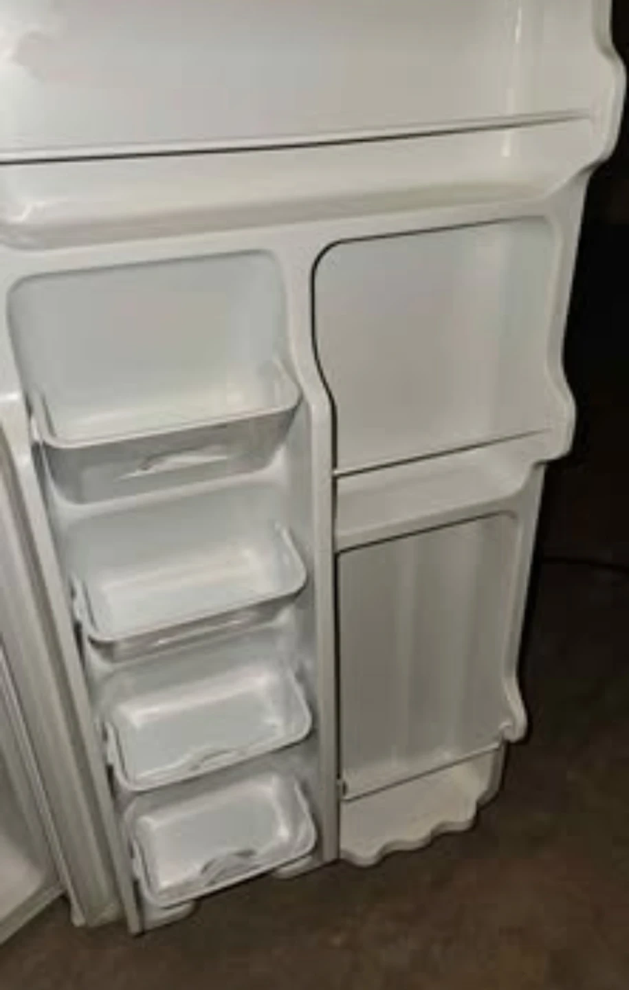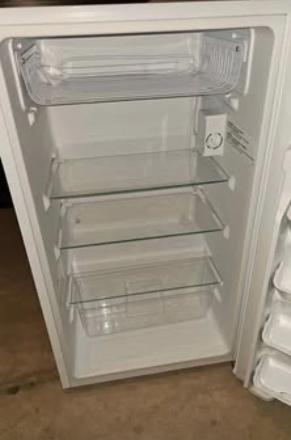 This is an Arctic King mini fridge. It's white and features multiple shelves and door bins for storage. Perfect for a dorm room or small apartment!