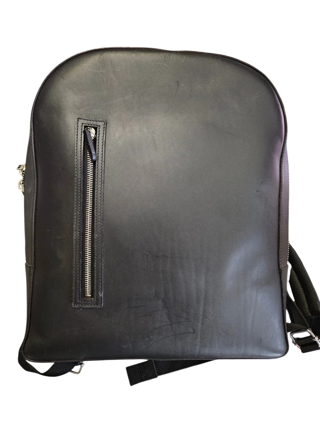 This black leather backpack is sleek and functional. It features padded shoulder straps for comfort and a zippered front pocket for easy access. Its leather construction makes it durable and stylish.